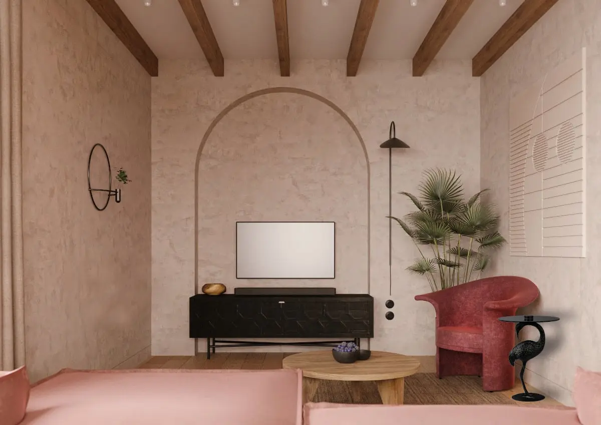 W salonie, tak jak w innych pomieszczeniach, króluje połączenie drewna, bordo, brudnego różu i terakoty. Charakteru wnętrzom nadają strukturalne tynki, które zdobią ściany. Obłe formy mebli wraz z łukiem, który symbolicznie wyznacza strefę telewizyjną, łagodzą projekt i wprowadzają do niego pierwiastek natury.
