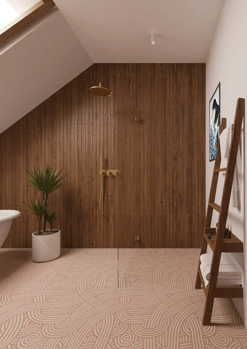 W domu, który zaspokaja potrzeby mieszkańców obcowania z naturą, nie mogło zabraknąć kącika w stylu wellness. Po całym dniu pracy aromatyczna kąpiel będzie jak balsam dla ciała i ducha. Nie bez znaczenia są rośliny obecne w salonie kąpielowym i okno dachowe znajdujące się bezpośrednio nad wanną. Nic nie działa na nasze samopoczucie tak dobrze jak światło słoneczne. Naturalną aranżację dopełnia struktura drewna obecna na ścianach i płytki w „esy-floresy” zdobiące podłogę.