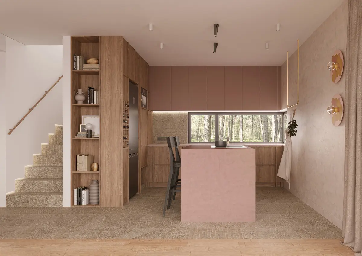 Centralnym miejscem domu jest otwarta przestrzeń. W zaułku, tuż za klatką schodową znalazła się niewielka kuchnia w odcieniach naturalnego drewna i brudnego różu. Złote detale uszlachetniają aranżację. Szafki zaprojektowane do sufitu i wyspa zwiększają funkcjonalność wnętrza.