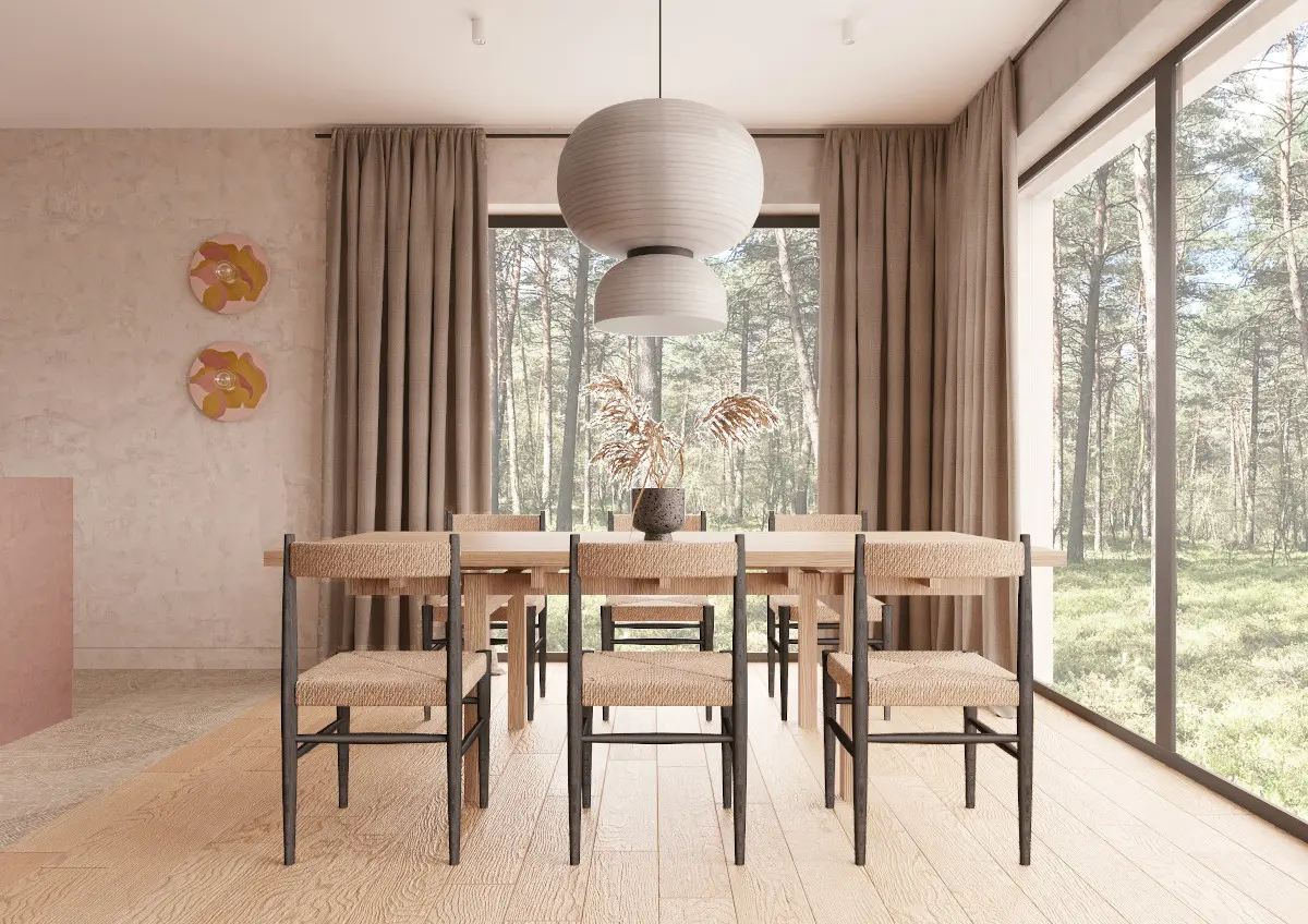 Z kuchnią sąsiaduje przeszklona jadalnia, do której, dzięki obecności dużych okien, wdziera się dzikość natury. Jej piękno idealnie komponuje się z blatem stołu, stworzonego z desek w klimacie wabi – sabi. Nad stołem znalazła się papierowa lampa nawiązująca designem do stylu japońskiego.