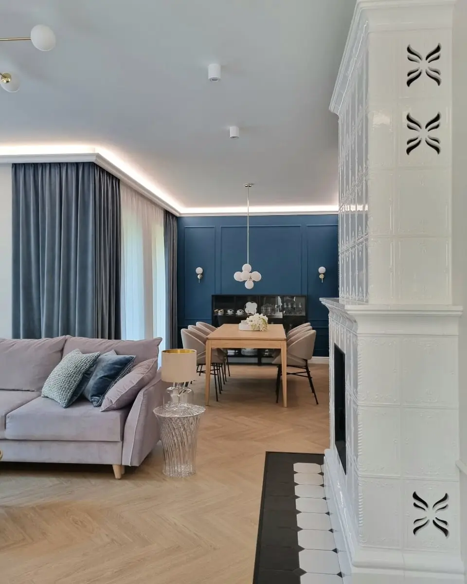 Wchodząc do domu Pauliny, ma się wrażenie, że wszystko funkcjonuje tu w perfekcyjnej harmonii. Salon w neutralnej palecie barw zaprasza do niespiesznego odpoczynku z widokiem na las. Dominują tu dwa świetnie pasujące do siebie kolory, chłodny odcień szarości i ciemny błękit. O ile pierwszy, nieco konserwatywny, można zauważyć w wielu realizacjach, to drugi, w połączeniu z różnorodną paletą neutralnych odcieni, jest już wyraźnym kontrastem, zwracającym na siebie uwagę. Sposób, w jaki wchodzi w grę z neutralnymi barwami, pomaga wydobyć ich ukryte odcienie. Szare sofy i drewniane elementy wprowadzają do pomieszczeń powiew świeżości. Ogólny efekt jest subtelny i spokojny, ale z pewnością nie bezbarwny.