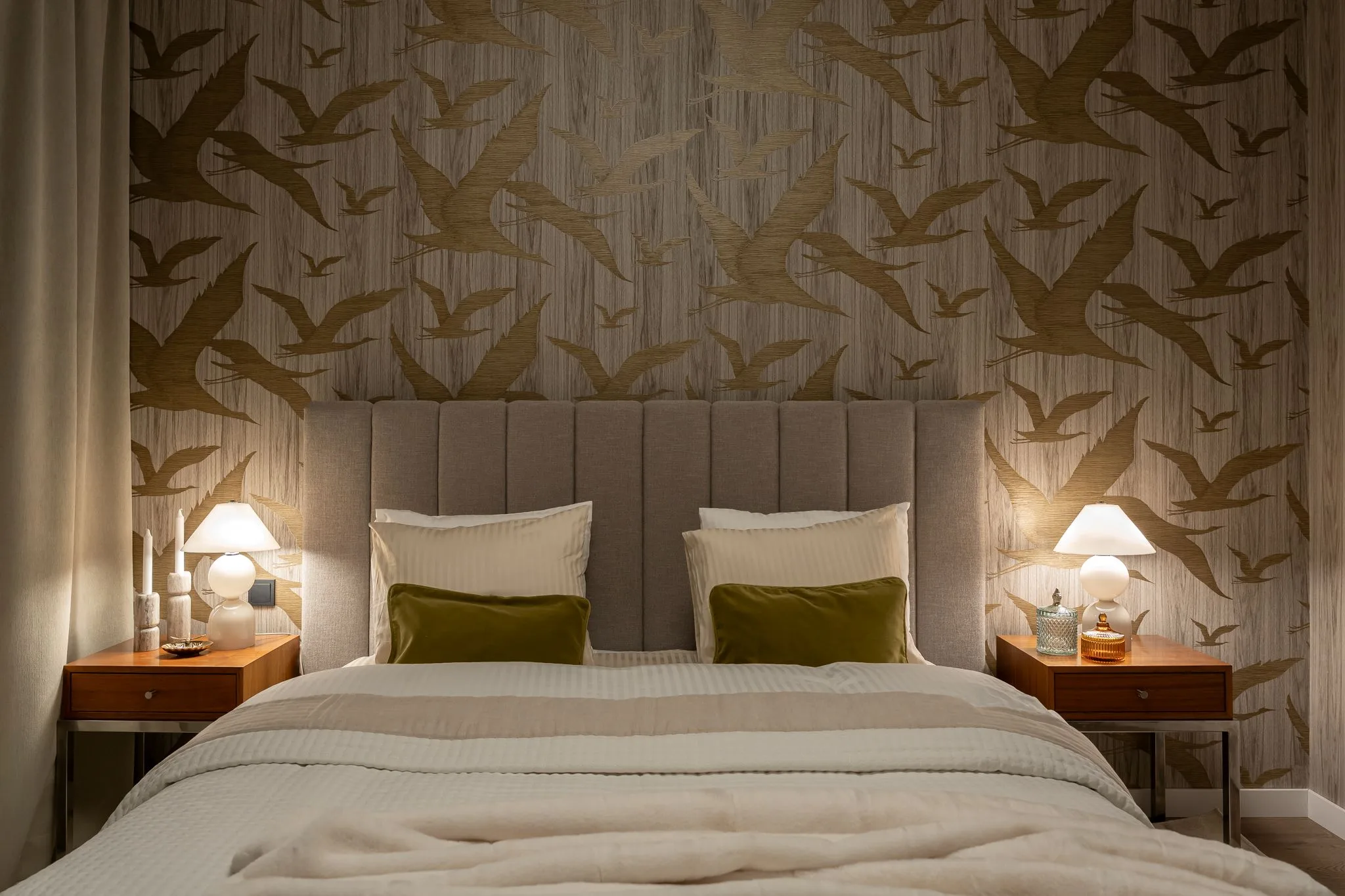 Sypialnia to enklawa ciszy. Tapeta od Arte, przypominająca nocne niebo, kontrastuje z subtelnie połyskującymi złotymi ptakami. Lustro w kształcie rybiego oka oraz fotel od HK Living wprowadzają do wnętrza nutę retro-futurystyczną. Całość zamyka tekstylna lampa Axo Light – jak chmura unosząca się nad snem.