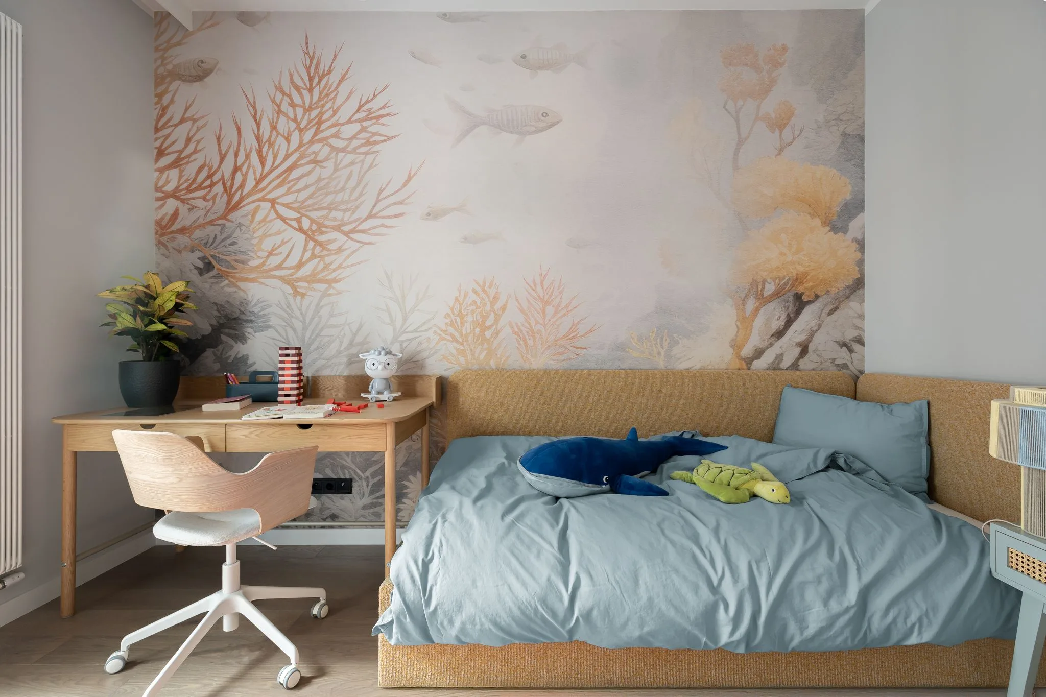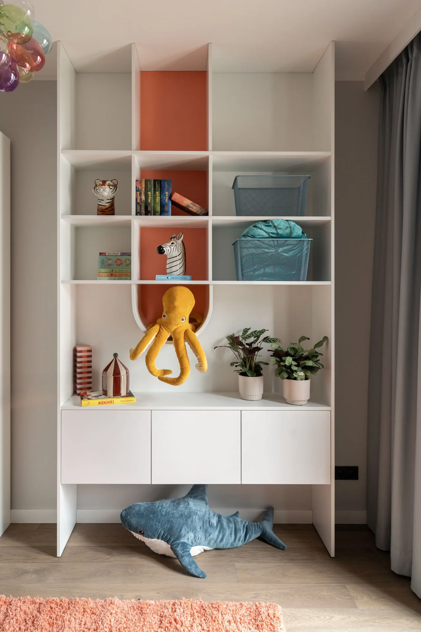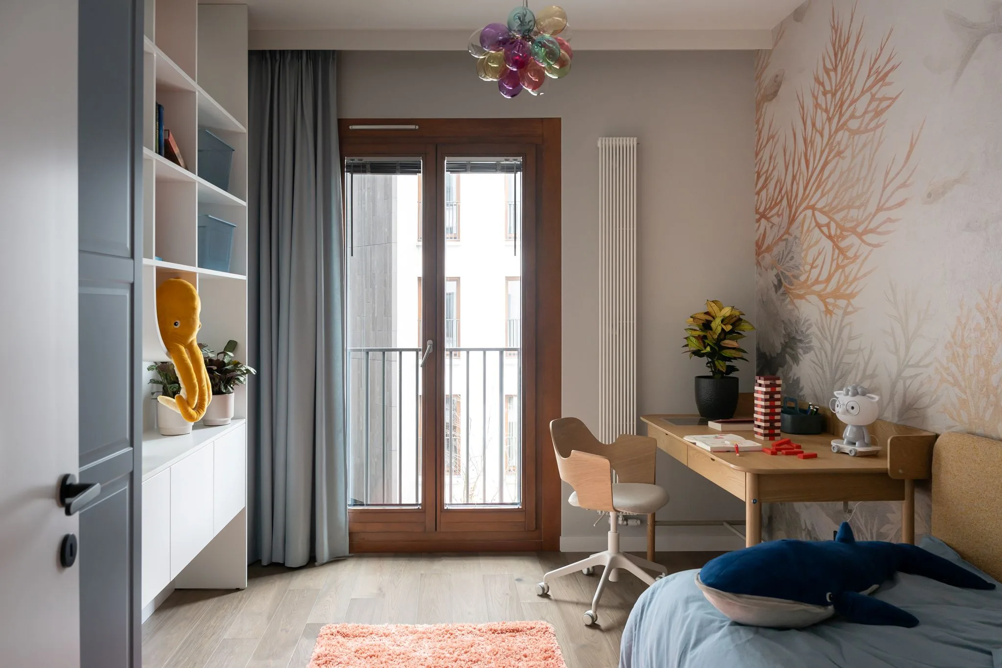 Pokój dziecka został zaprojektowany z myślą o przyszłości. To przestrzeń, która może dorastać wraz z dzieckiem, bez potrzeby rewolucji. Pastelowa baza uspokaja, a lampa przypominająca ikrę unoszącą się w wodzie tworzy atmosferę subtelnej baśni. Wszystko tu zostało przemyślane – z wyczuciem, ale i dystansem wobec oczywistości.