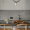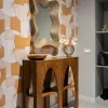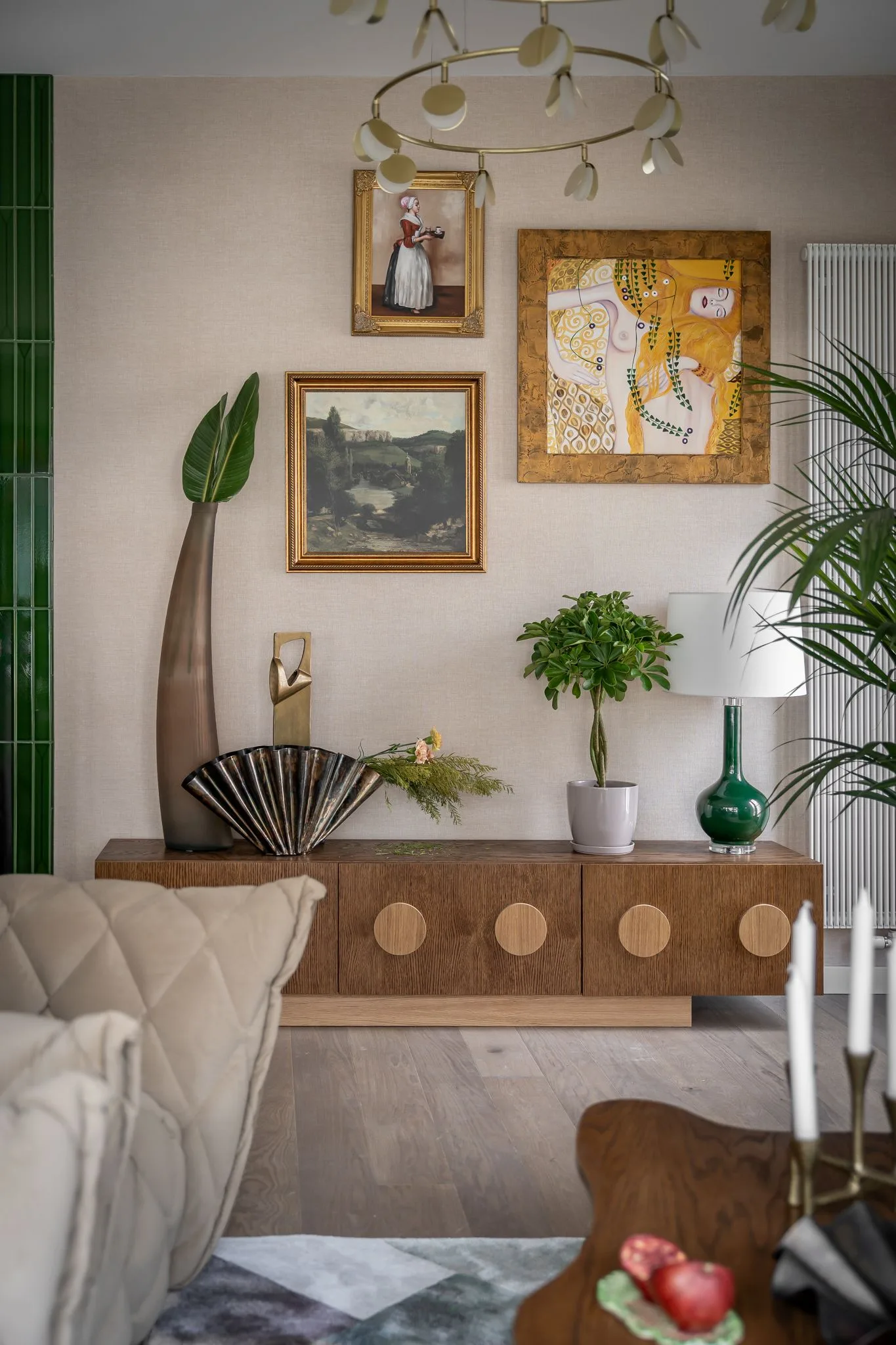 W Baltic Bloom kolor ma swoją funkcję – i swoją poezję. Dominuje tu przygaszona zieleń – głęboka jak leśny mech i wodna roślinność. Towarzyszą jej piaskowe beże, ciepłe odcienie drewna oraz złoto i srebro – delikatne, nie ostentacyjne, w balansie. Kafle w salonie mają odcień przypominający zanurzoną zieleń, podczas gdy tapeta w sypialni przypomina strukturą fornir – pękniętą korę albo wygładzony kamień.
