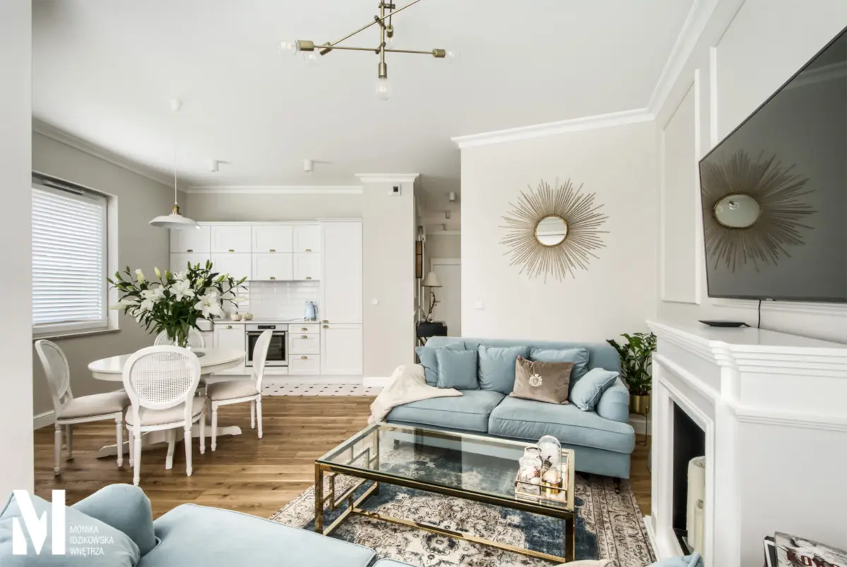 Strefę stricte wypoczynkową wydziela bardzo modny obecnie dywan. Jego postarzana faktura doskonale przełamuje elegancki look wnętrza, który też nie jest dziełem przypadku. Obecność sztukaterii, lustra – słońce w złotej ramie i w tym samym wykończeniu opraw oświetleniowych, sprawia że salon przypomina wnętrze paryskiej kamienicy. Błękitne sofki ustawione naprzeciwko siebie łączy szklany stolik na złotym stelażu. O klimat rodzinnego ciepła zadba biokominek.
