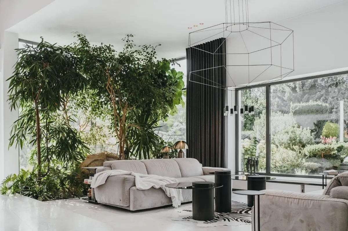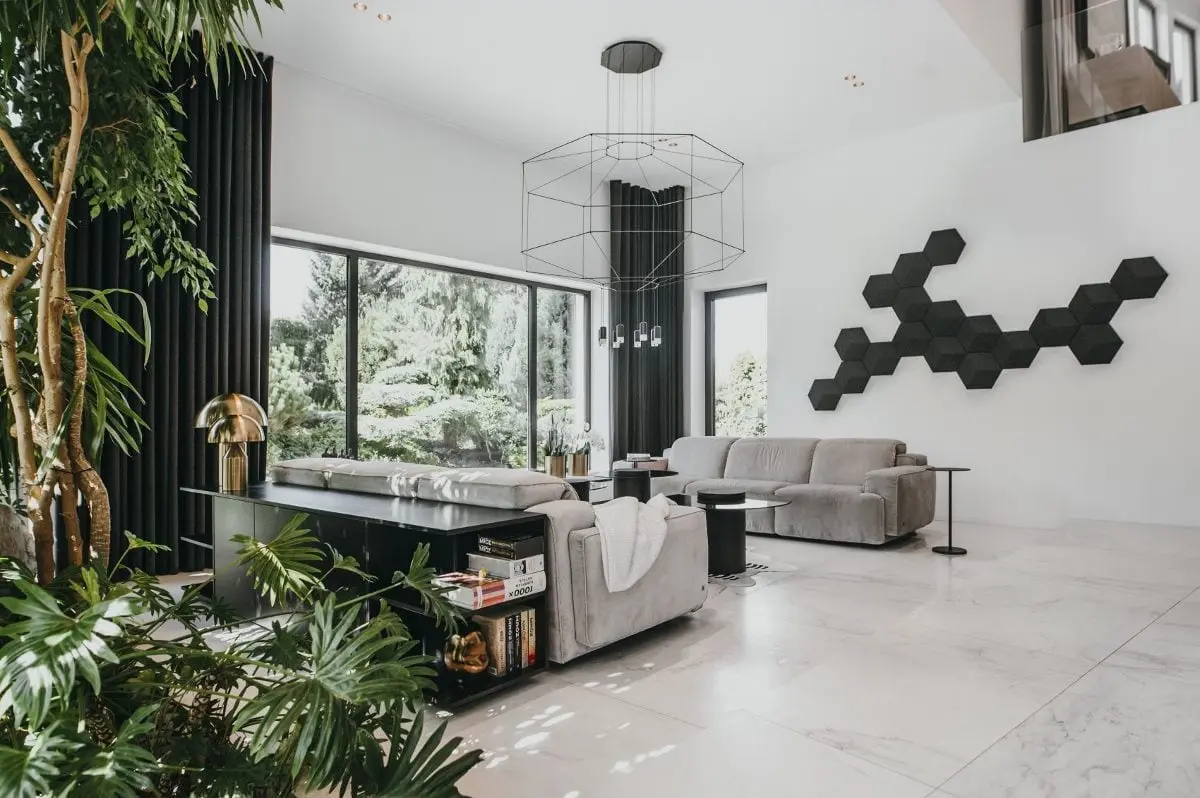 Część dzienna jest minimalistyczna, pełna prostych, geometrycznych kształtów. Podłoga na całej powierzchni została wykończona marmurowymi płytami. W części wypoczynkowej stanęły dwie wygodne, szare sofy. Wyjątkową ozdobą i jednocześnie akcentem kolorystycznym jest istna domowa dżungla wykreowana z zielonych roślin. Ten wewnętrzy ogród harmonijnie współgrająca z piękną przyrodą za oknem.