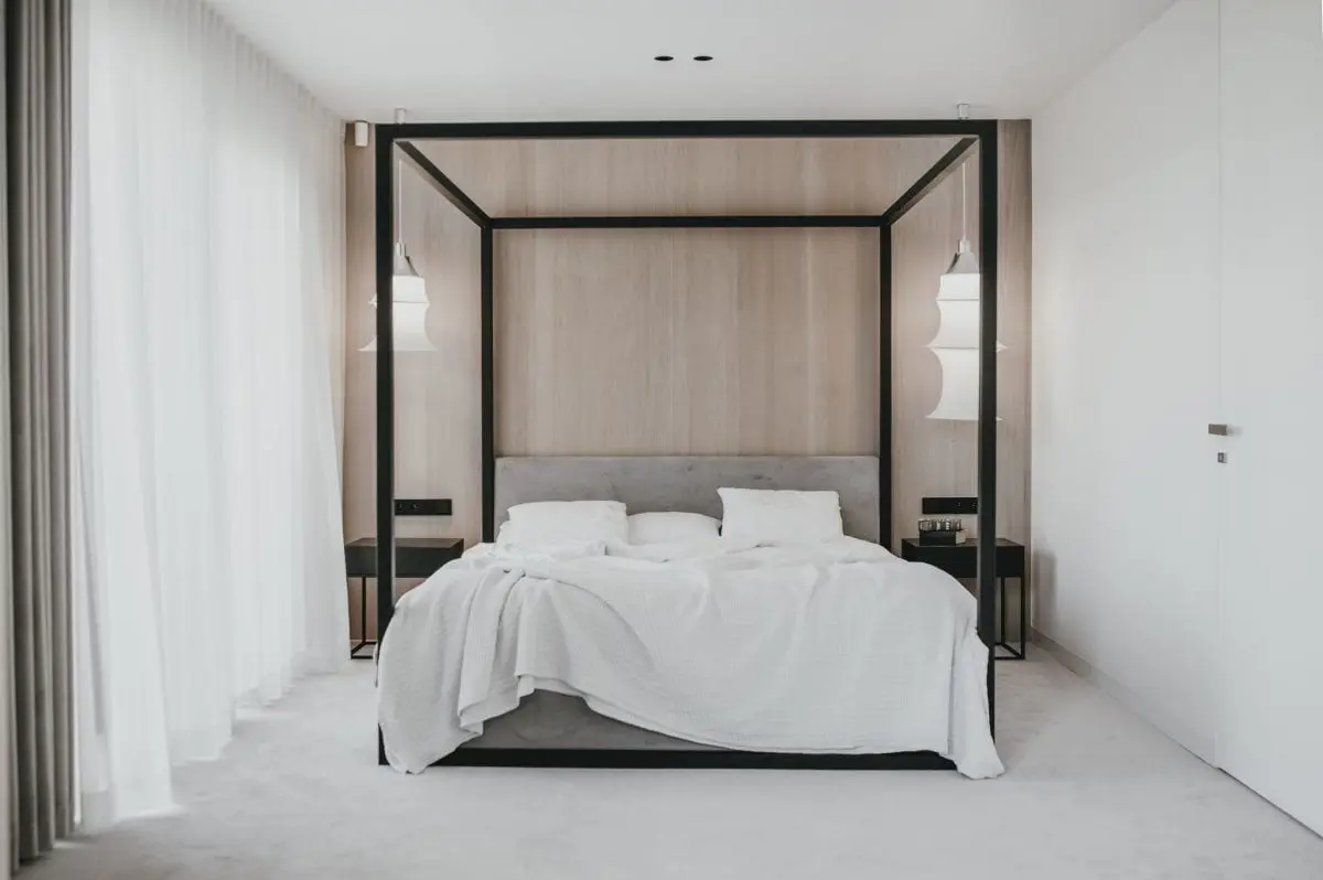 Strefę prywatną właścicieli zorganizowano na antresoli. Znajduje się tutaj sypialnia połączona z garderobą i łazienką. Przestrzeń piętra, również zyskała otwarty układ. W porozumieniu z inwestorami, architekci postanowiliśmy wyburzyć jedną ścianę sypialni, eksponując duże łóżko z baldachimem. Zlikwidowaną ścianę zastąpili ogromnymi drzwiami przesuwnymi z jasnego forniru dębowego, który konsekwentnie pojawia się w całym domu. Biały podświetlony sufit napinany nad klatką schodową oraz zastąpienie stalowych balustrad szklanymi, transparentnymi taflami dodatkowo otworzyły przestrzeń piętra.