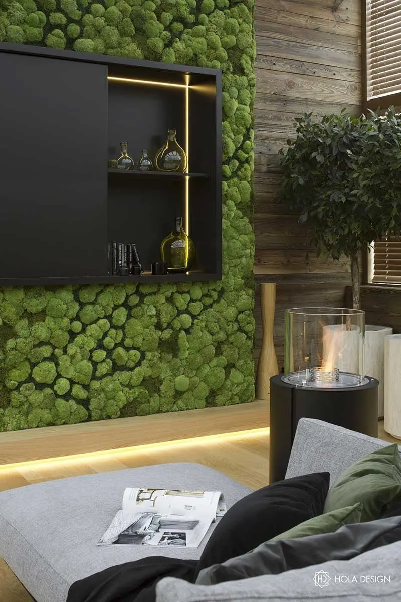 Jak zdradzają architekci, właścicielom zależało na wyodrębnieniu miejsca, w którym znajdą wytchnienie od otaczającego dom miejskiego zgiełku. Stała się nim przydomowa oranżeria. Jej centralnym punktem jest wygodna sofa, którą otaczają liczne rośliny oraz ściany pokryte mchem. Wokół domu zaaranżowano oryginalny ogród, gdzie oprócz drzew, krzewów i kwiatów pojawiają betonowe elementy architektoniczne, m.in. basen i fontanna.