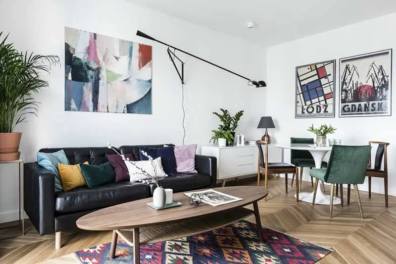W zaprezentowanym w dzisiejszym wpisie projekcie zdecydowanie panuje styl eklektyczny. Widać to najwyraźniej w salonie. Znajdziemy tu elementy w klimacie etno (chociażby dywan), klasyczny parkiet, krzesła obite aksamitnym welurem, industrialny kinkiet oraz komodę w scandi klimacie. ,,Kropką nad i” są plakaty i obrazy dodające aranżacji charakteru.