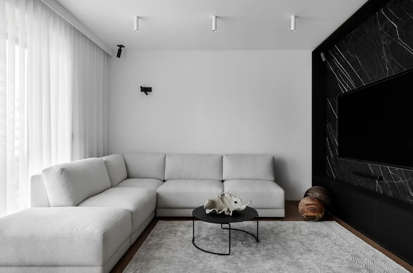W salonie główną rolę odgrywa rodzinny narożnik w odcieniu złamanej bieli. Naprzeciwko pojawiła się ściana telewizyjna zaakcentowana czarną płytką wielkoformatową z rysunkiem kamienia. Wystrój dopełniają drewniane kule woood4you.