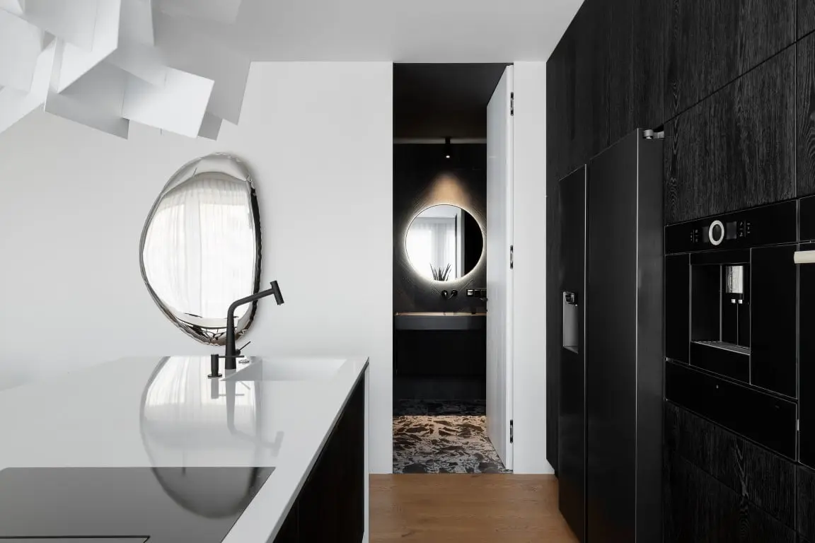 Często mniej znaczy więcej, a projekt zrealizowany przez arch. Małgorzatę Moskal (Mossi Atelier) jest tego doskonałym przykładem. Monochromatyczna aranżacja złożona z kontrastowych barw: czerni i bieli, tworzy doskonałe tło dla designerskich elementów wyposażenia. Minimalistyczny wystrój pozwala im odpowiednio wybrzmieć a wszystko to bez uszczerbku na pełnej funkcjonalności apartamentu, który w rzeczy samej powstał z dwóch małych mieszkań. W efekcie spełniło się marzenie inwestora o przestronnej strefie dziennej z otwartym na salon aneksem kuchennym. Jej sercem jest kultowe lustro – rzeźba zaprojektowane przez współczesnego polskiego designera Oskara Ziętę.