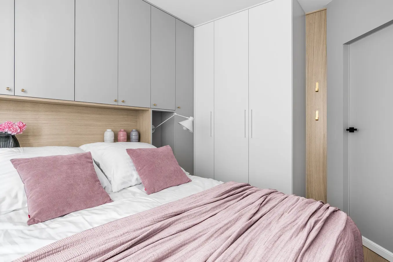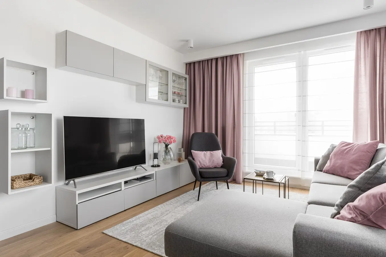 Przedstawiony projekt aranżacji mieszkania to bardzo przyjemna mieszanka szarości z różem, z dodatkami szlachetnego złota i marmuru. Wnętrze stonowane, eleganckie pozbawione zbędnych dekoracji, bardzo kobiece i delikatne. Róż jest tu ciekawym akcentem dekoracyjnym, i jeśli nam się znudzi w prosty sposób możemy zmienić dodatki na inny kolor. W salonie znajduję się duży szary, wygodny narożnik z szezlągiem i oczywiście stylowy, lekki szary fotel, w którym wygodnie możemy oddać się relaksowi z książką. Mieszaknie funkcjonalne, nowoczesne i minimalistyczne, pełne ciekawych dekoracyjnych smaczków, jak złote detale w postaci zegara, tapety czy przepięknych uchwytów przy szafkach.