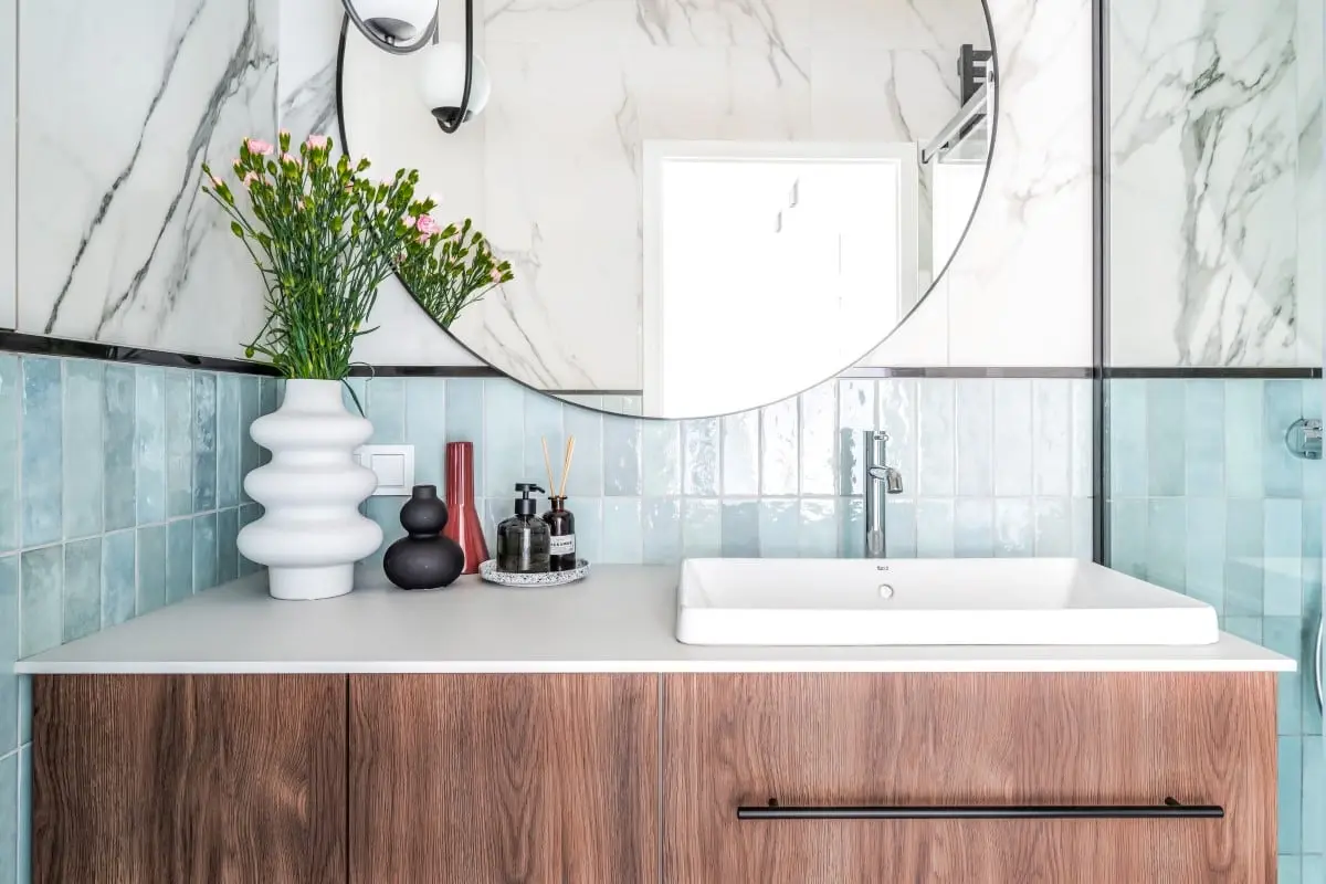 W łazience znajdziemy kontynuację połączenia denim blue z drewnem. Modne kafelki o niejednolitej tonacji i kontrolowanych nieregularnościach, przełamuje elegancki marmur. Czarne detale zastosowane w prostej formie, jak klamra kompozycyjna, spinają aranżację.