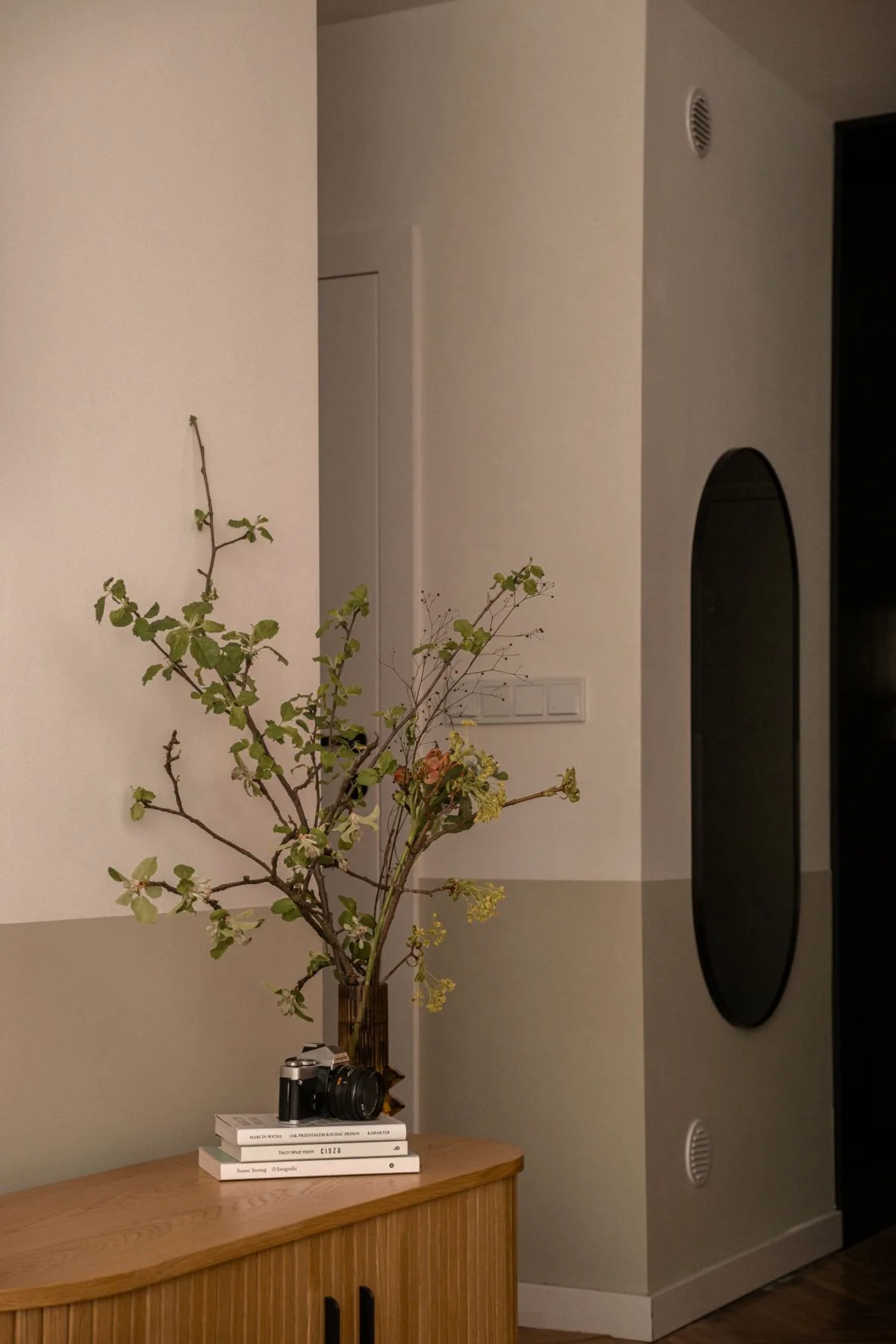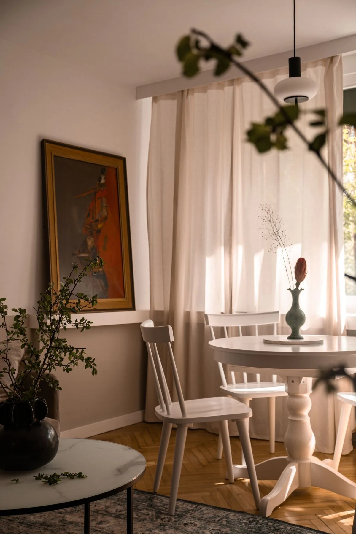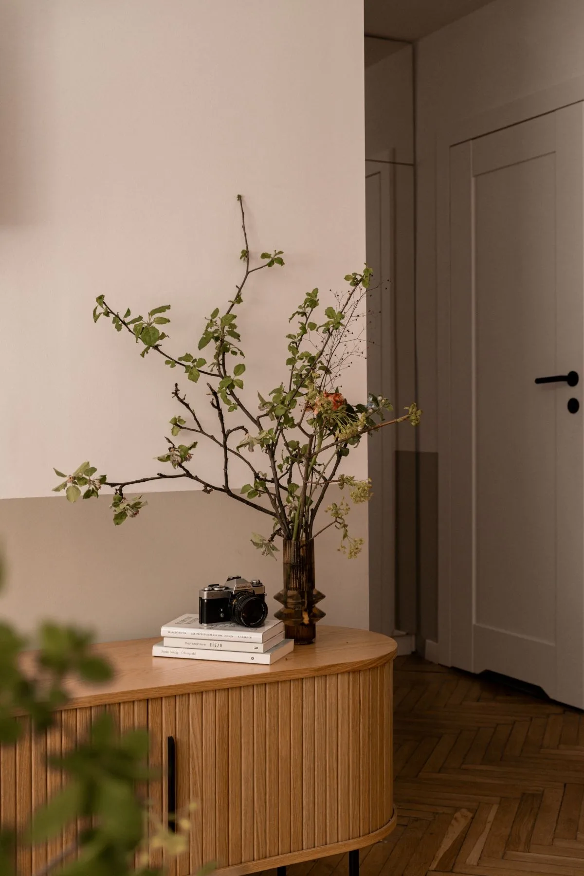 We wnętrzu pojawiły się także przedmioty ważne dla właścicielki. Na półce oparto obraz autorstwa Krzysztofa Buckiego – mocny, kolorystyczny akcent, który przełamuje delikatność przestrzeni. Obok niego stanął drewniany posążek zamyślonego Chrystusa – pamiątka pełna osobistego znaczenia. To właśnie takie detale czynią mieszkanie niepowtarzalnym i głęboko zakorzenionym w historii właścicielki.