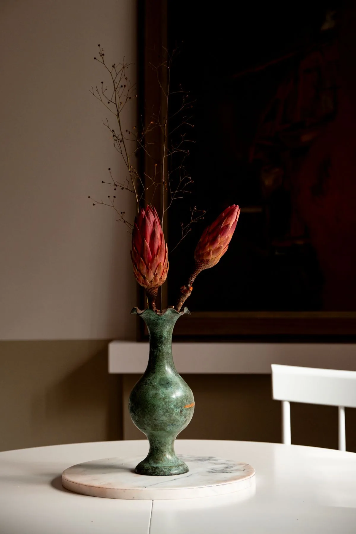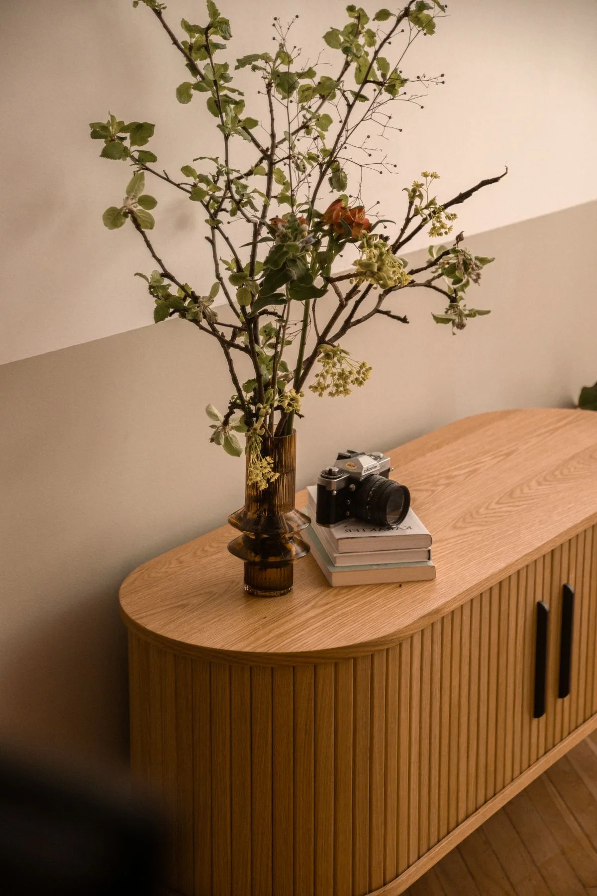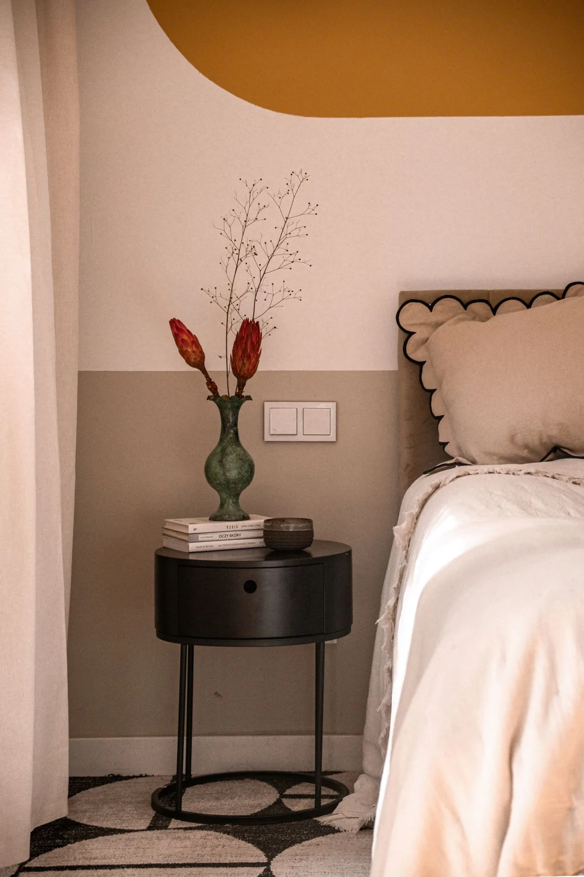 We wnętrzu pojawiły się także przedmioty ważne dla właścicielki. Na półce oparto obraz autorstwa Krzysztofa Buckiego – mocny, kolorystyczny akcent, który przełamuje delikatność przestrzeni. Obok niego stanął drewniany posążek zamyślonego Chrystusa – pamiątka pełna osobistego znaczenia. To właśnie takie detale czynią mieszkanie niepowtarzalnym i głęboko zakorzenionym w historii właścicielki.