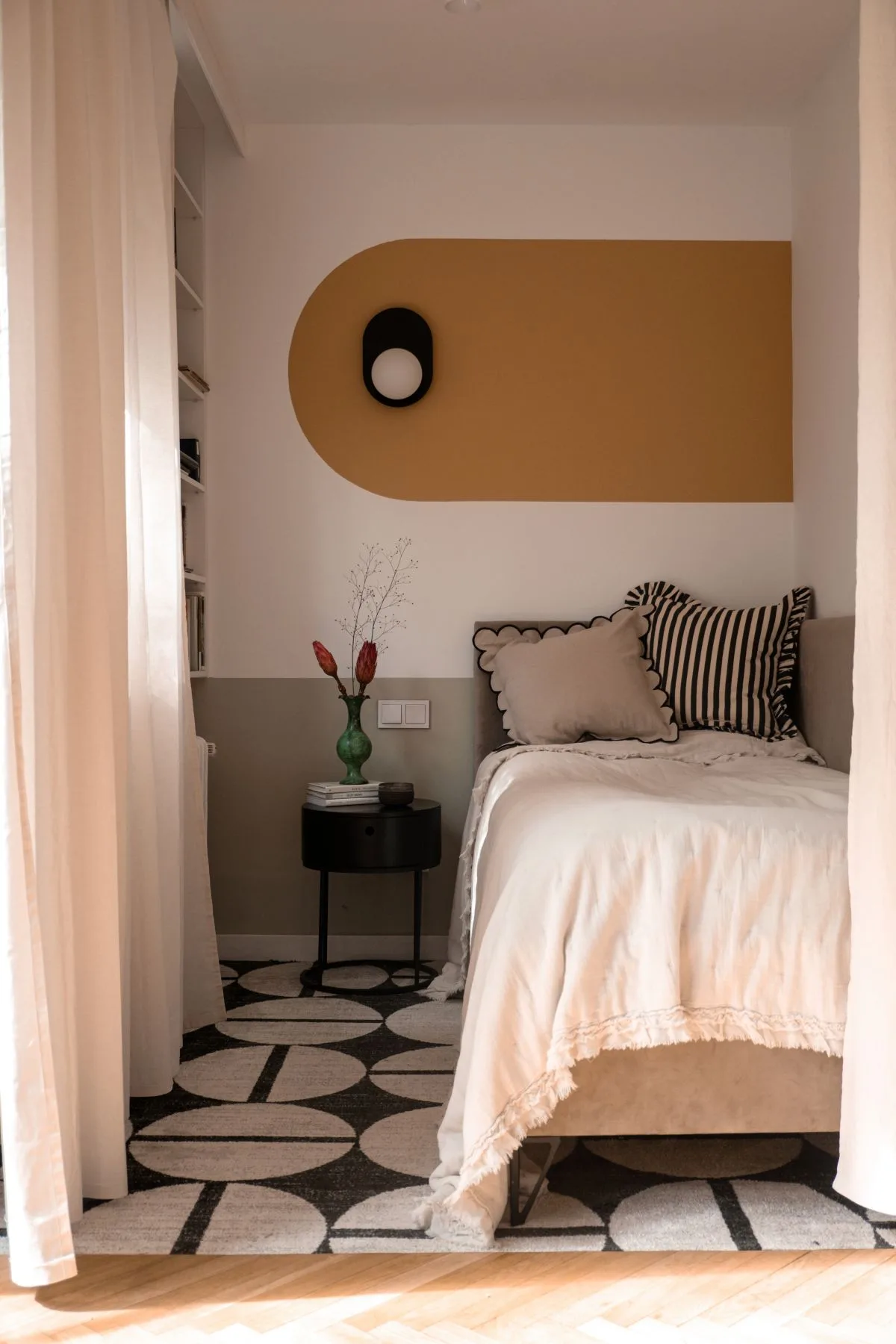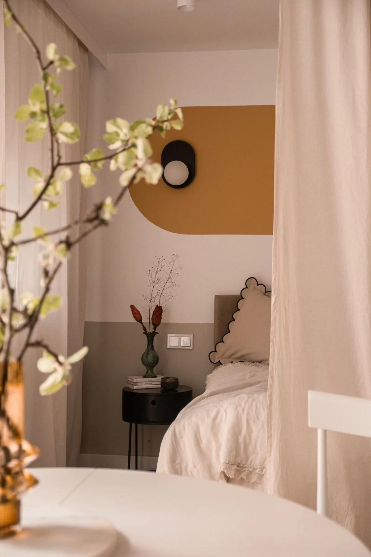 Mieszkanie należy do emerytowanej singielki, która marzyła o pogodnym i subtelnym, ale jednocześnie niezbyt „poważnym” wnętrzu. Remont stał się okazją do zmiany układu funkcjonalnego, dopasowanego już nie do potrzeb rodziny, a do wygody jednej osoby. Dawny pokój dziecięcy ustąpił miejsca większej strefie dziennej – przestrzeń sypialniana została symbolicznie wydzielona za pomocą zasłony, tworząc intymny, ale lekki zakątek na łóżko.