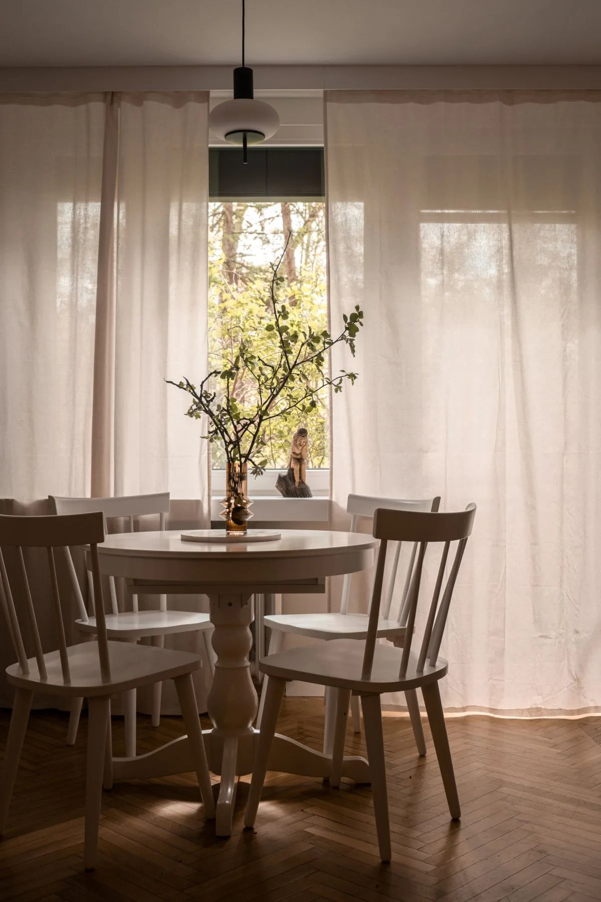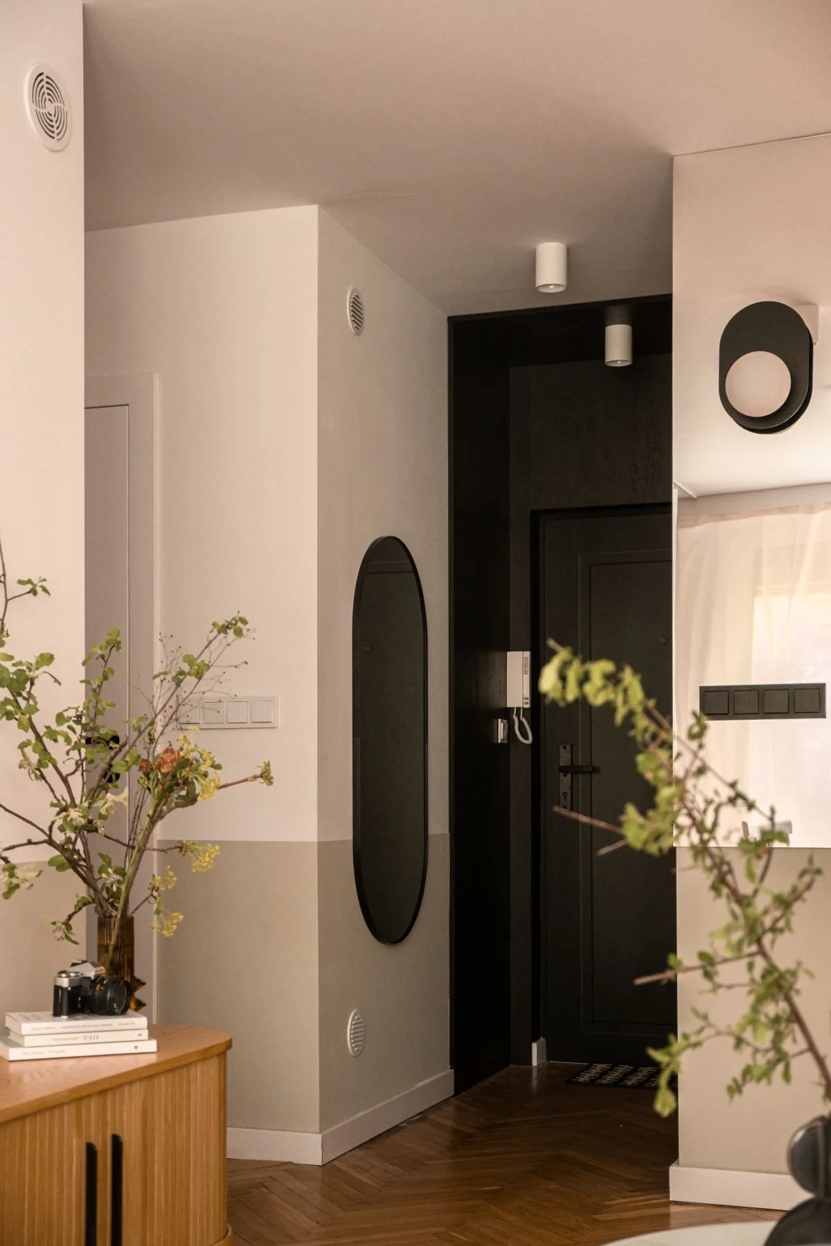 Ponieważ mieszkanie znajduje się na parterze, projektanci zadbali o to, aby maksymalnie doświetlić jego głębię. Jasne ściany, subtelna groszkowa lamperia i duże lustra odbijające światło sprawiają, że wnętrze zyskuje świeżość i lekkość. Roślinność ogródka za oknem przenika do środka, budując wrażenie bliskości z naturą.