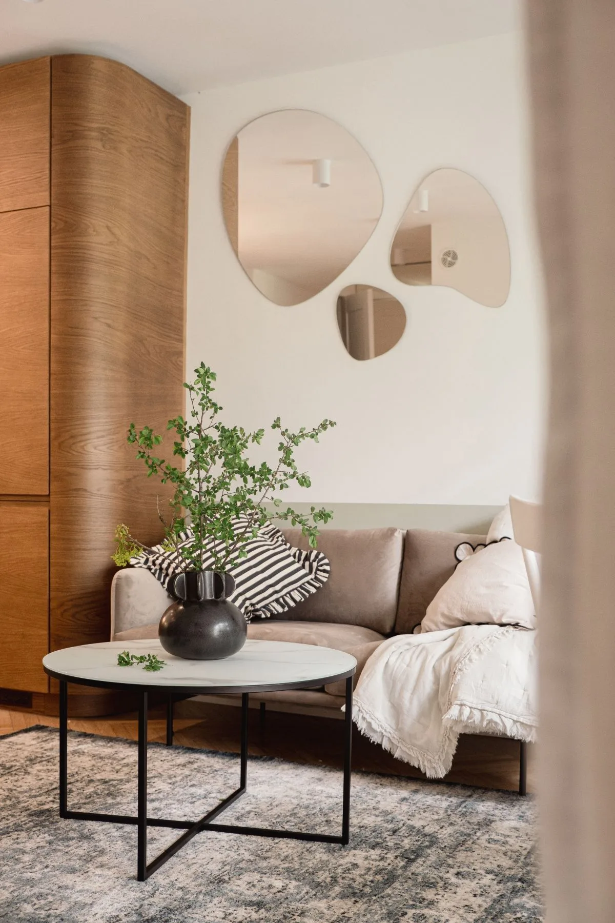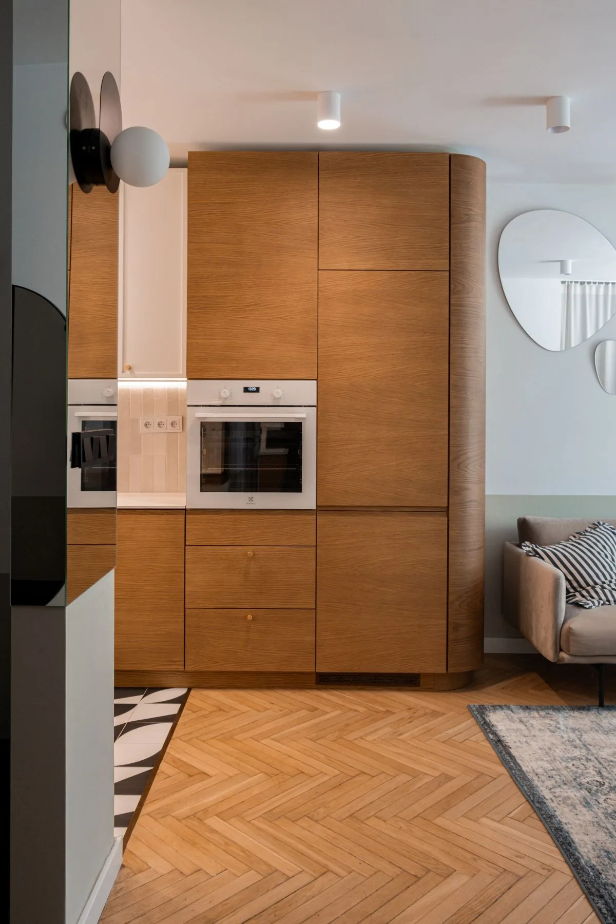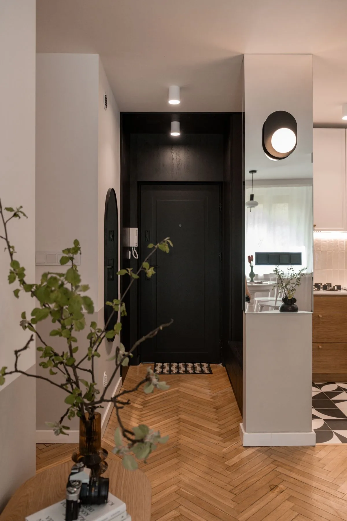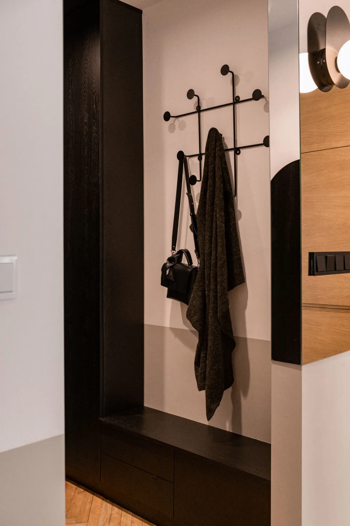 Kluczowym życzeniem właścicielki była też przestrzeń do przechowywania, dlatego w projekcie pojawiła się wygodna garderoba. Dzięki temu mieszkanie, mimo niewielkiego metrażu, sprawia wrażenie przestronnego i uporządkowanego.
