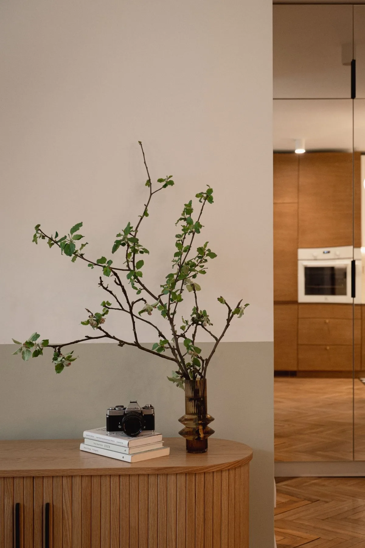 W samym sercu krakowskich Bronowic, w kameralnym budynku z lat 60., mieści się 36-metrowe mieszkanie, które dzięki pracowni Kontraforma zyskało nową, lekką i pełną wdzięku odsłonę. Lokal, położony w zielonej i cichej okolicy, sąsiaduje ze spacerową alejką prowadzącą w stronę parku Młynówka Królewska. Z parterowych okien rozciąga się widok na ogródki lokatorskie – pachnące bzem i forsycją – co tworzy wyjątkowo sielską atmosferę.