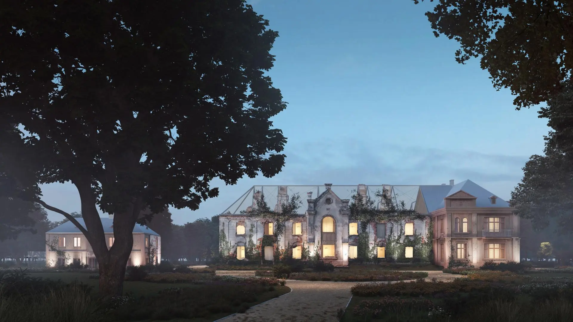 Do wnętrza zachowanej starej części pałacu zostaną wstawione drewniane kubiki mieszkalne z przeszkleniami kadrującymi widoki na oryginalne fragmenty ścian i stropów historycznej budowli. – Wykorzystamy ten sam budulec, z którego wykonane będzie wschodnie skrzydło pałacu – mówi architekt, podkreślając, że jest to rodzaj gry, dialogu materiałów. Wstawione ultranowoczesne moduły, w których powstaną pomieszczenia dla artystów, będą miały własne zadaszenia. Jednocześnie nowa część infrastruktury zostanie odseparowana od trwale zawilgoconych, zasolonych i częściowo zdegradowanych historycznych ścian. Dach nad centralną częścią pałacu zostanie odtworzony tylko fragmentarycznie i w formie płaskiego przesklepienia ze szkła. Stalową konstrukcję wzmacniającą „rysującą w przestrzeni obrys dawnego dachu” pokryje stalowa siatka, po której będą mogły piąć się rośliny, dzięki czemu powstanie coś na kształt przestrzennej pergoli. – Pałac przez lata, gdy niszczał, naturalnie zrósł się z zielenią, która jest częścią jego tożsamości – mówi Aleksander Jankowski. – Chcemy ten fakt uwzględnić, nawiązując jednocześnie do polskiej tradycji obsadzania dworów, pałaców, ale też miejskich kamienic pnączami i dekoracyjną zielenią.