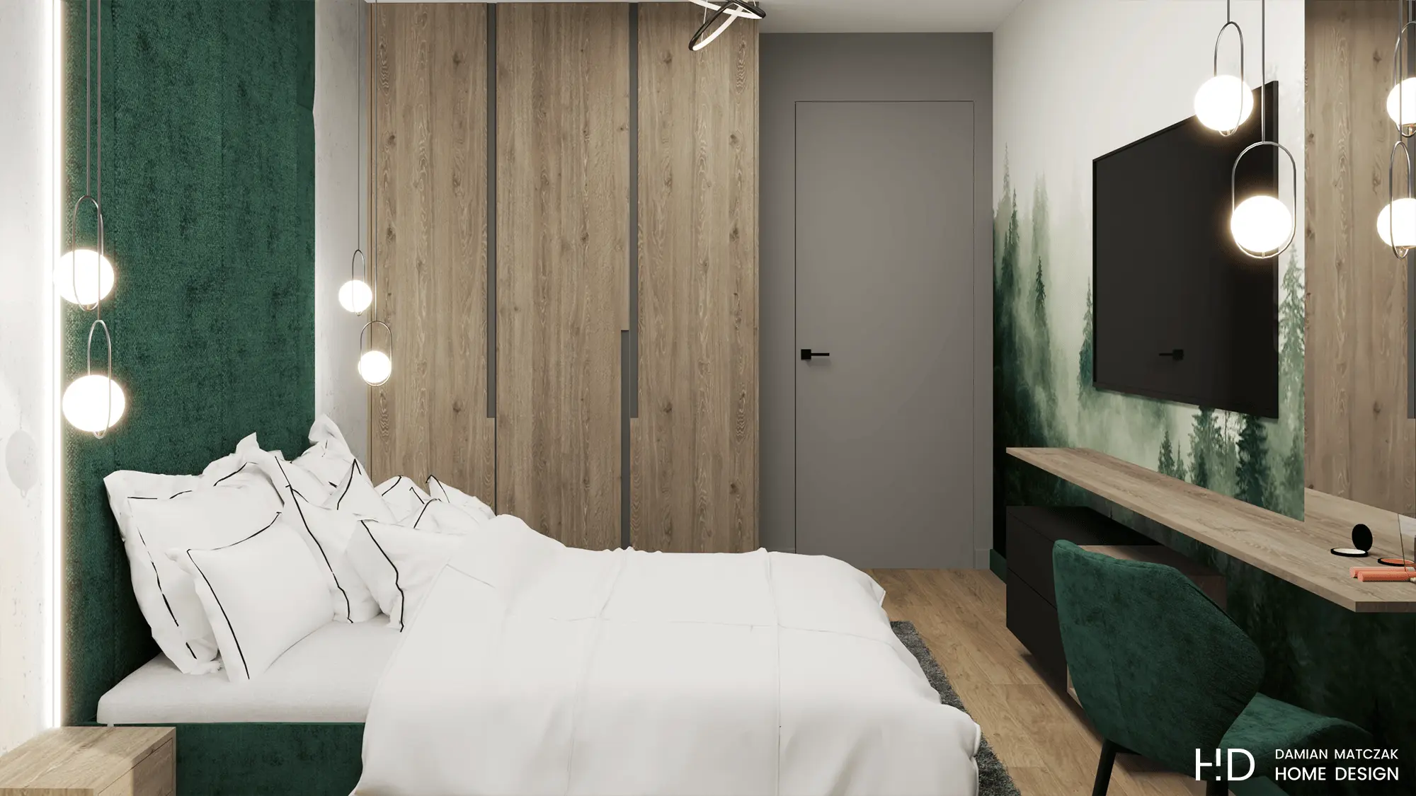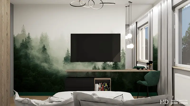Sypialnia jest kontynuacją zabiegu kolorystycznego ze strefy dziennej mieszkania. Nad łóżkiem zastosowano zielony, tapicerowany zagłówek, który pokrywa ścianę aż do sufitu. Nad szafkami nocnymi umieszczono natomiast klimatyczne oświetlenie. Te elementy sprawiają, że wnętrze staje się przytulne pomimo mocnych akcentów. Na przeciwległej ścianie zastosowano tapetę z motywem lasu, która jest idealnym tłem dla strefy telewizyjnej oraz toaletki. Oczywiście w strefie prywatnej nie mogło zabraknąć miejsca dla dużej i przestronnej szafy.