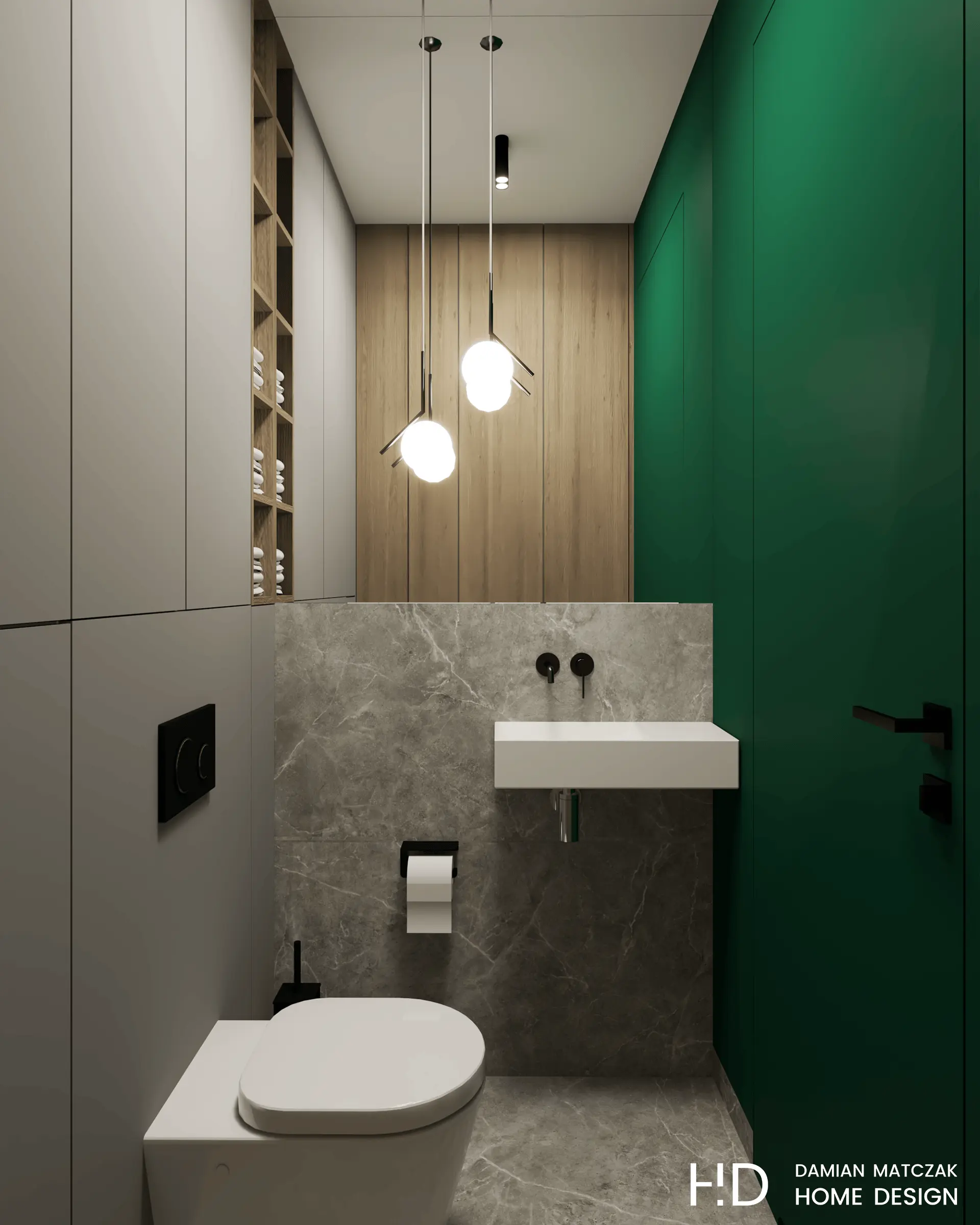 WC potraktowano jako swoiste przedłużenie kolorystyki holu – mamy tutaj szary gres z białą żyłką oraz drzwi ukryte w kolorze ściany, czyli w kolorze butelkowej zieleni. Dla dopełnienia całości wybrano nowoczesne oświetlenie oraz lustro na całą szerokość ściany nad małą umywalką. Funkcjonalnym rozwiązaniem jest zabudowa pralki i dodatkowe przechowywanie.