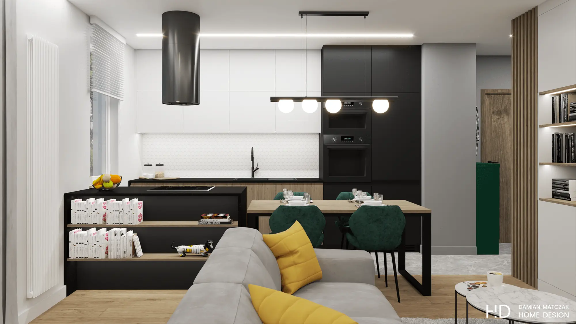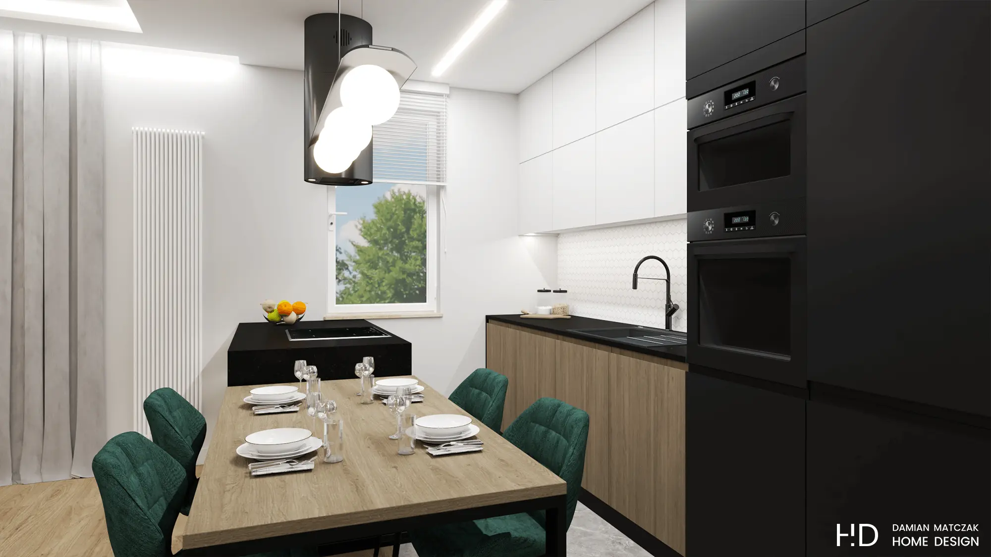 Kuchnia została oddzielona od salonu dużą wyspą kuchenną z płytą indukcyjną oraz okapem. Wyspa została przedłużona o loftowy stół z czterema krzesłami wykończonymi zieloną tkaniną.