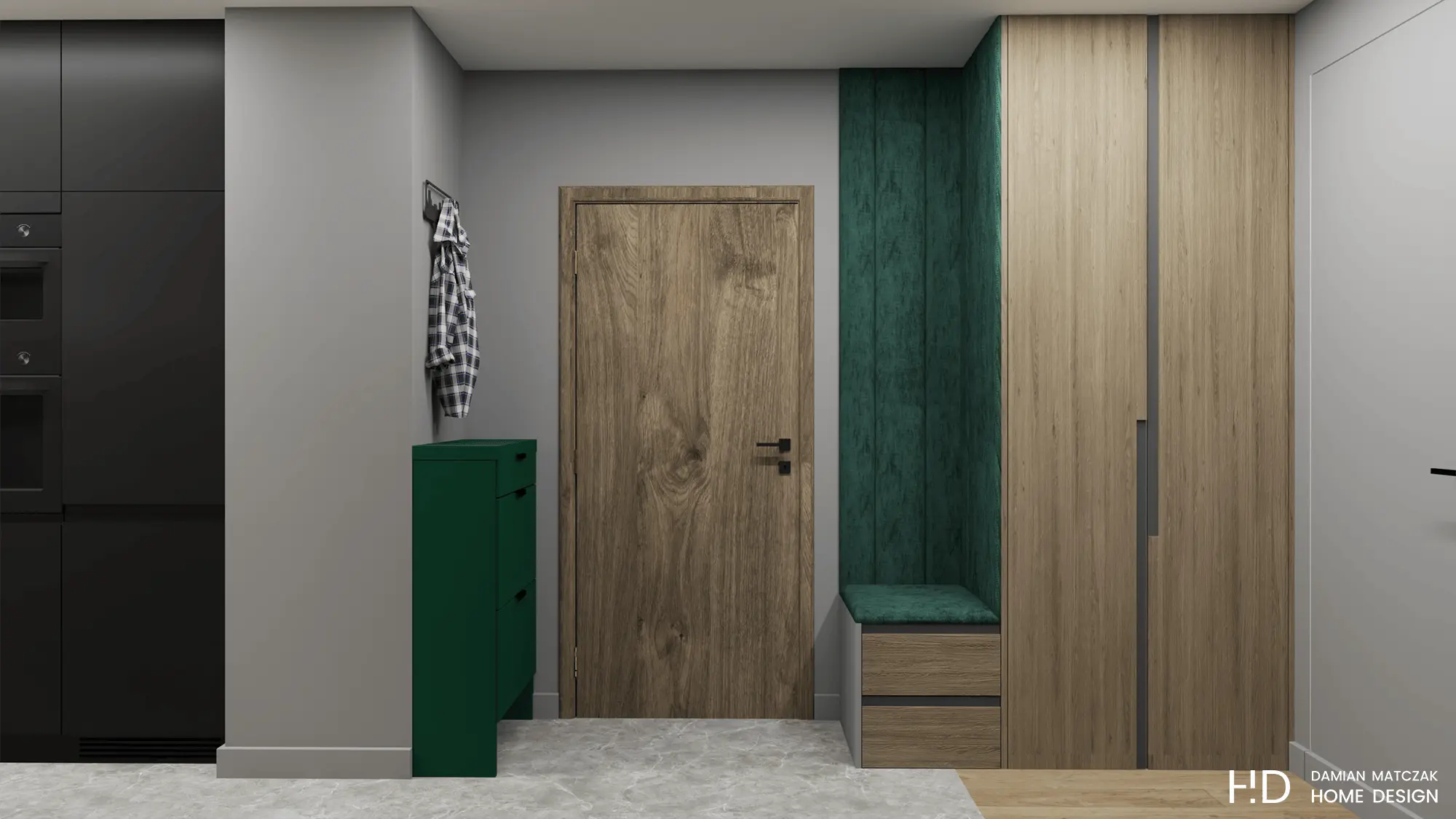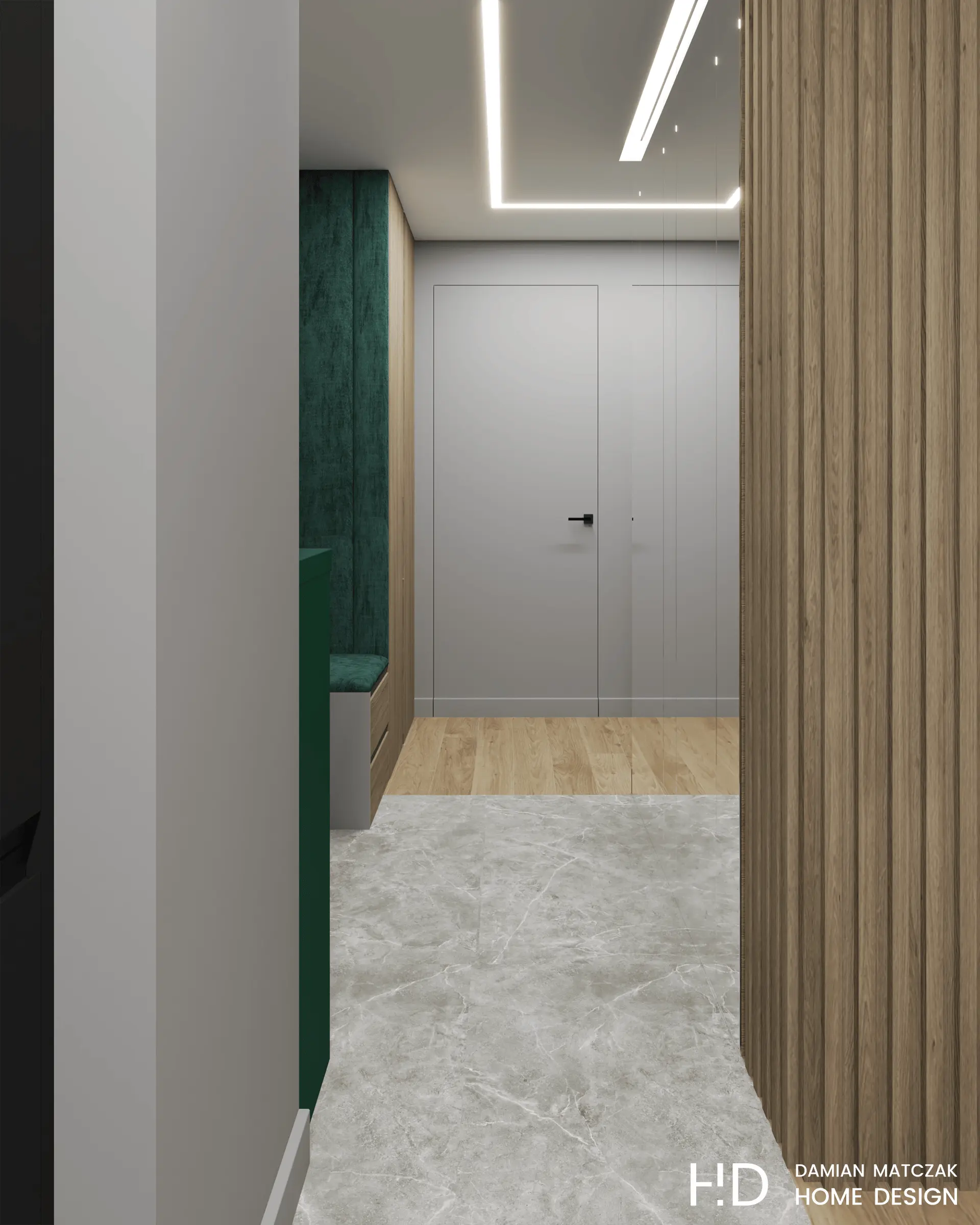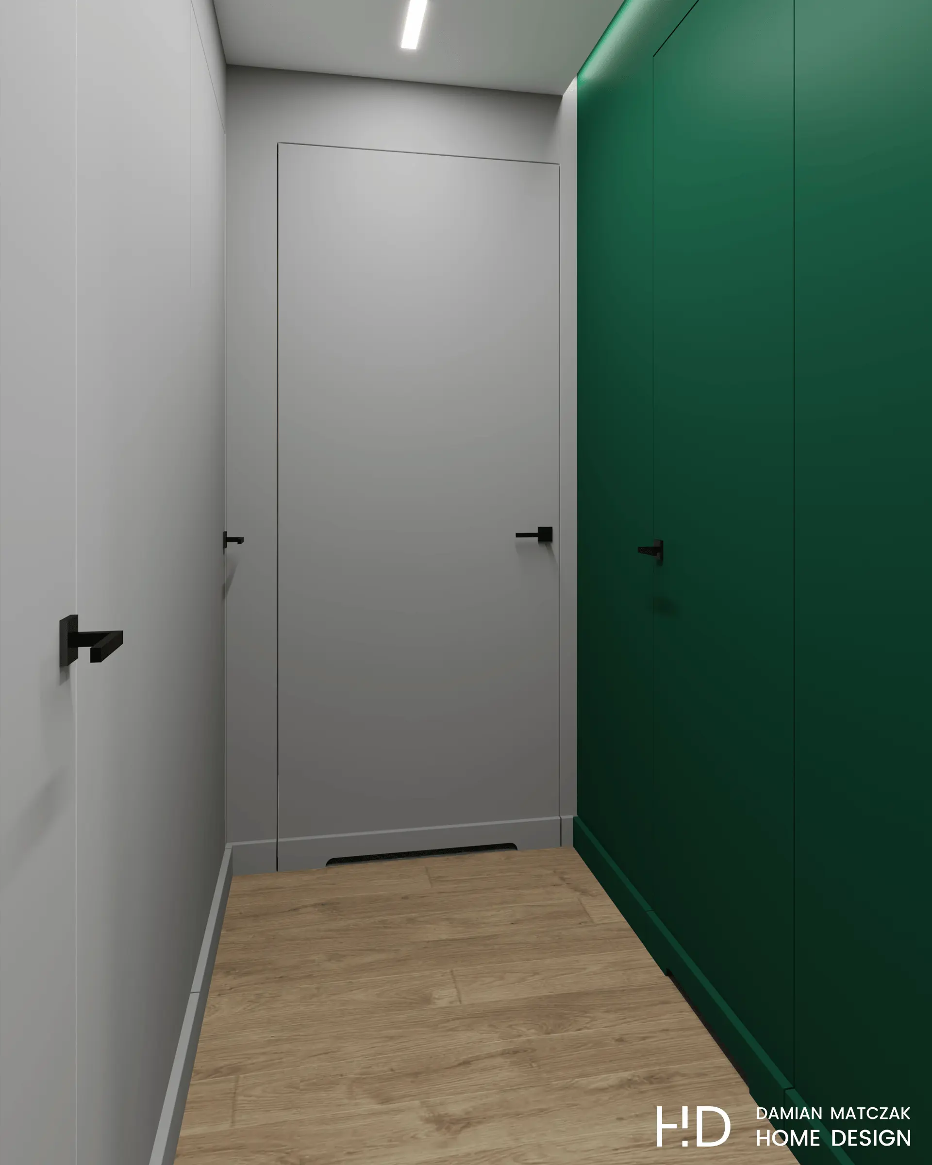 Hol posiada obszerny korytarz, którego podłoga została wyłożona gresem. Tuż po przekroczeniu progu mieszkania zauważalny jest dominujący akcent butelkowej zieleni, który zastosowano, jako element dopełniający całość. Drzwi z ukrytą ościeżnicą w kolorze ścian znalazły idealne zastosowanie w tym wnętrzu. W przestrzeni wejściowej nie mogło też zabraknąć siedziska i dużej szafy.