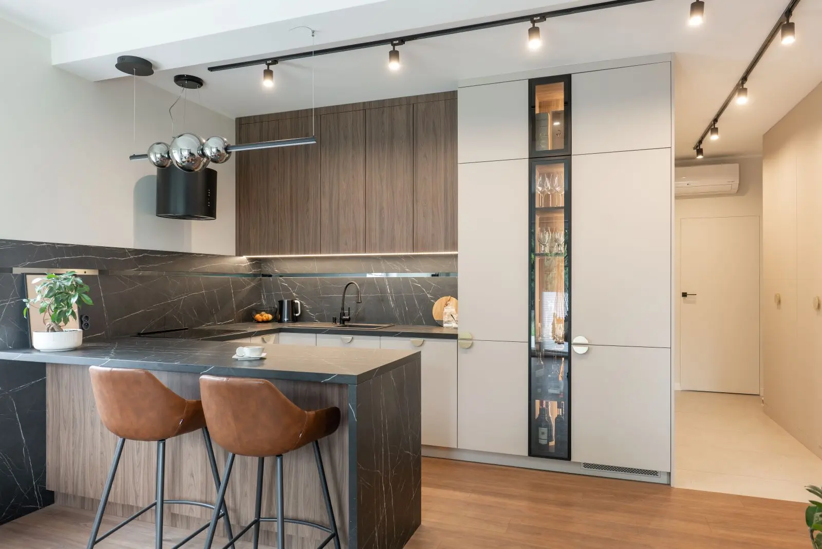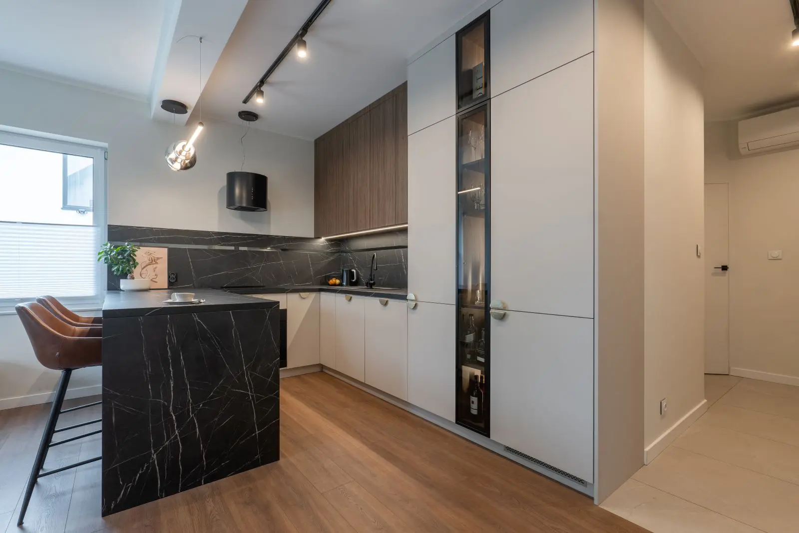 Uzupełnieniem naszej kuchennej aranżacji jest kamień z delikatnym białym żyłkowaniem, który zastosowaliśmy na blatach oraz niektórych ścianach. Kamień wprowadza do wnętrza elegancję i luksus, a białe żyłkowanie dodaje mu lekkości i subtelności. Dzięki temu, cała przestrzeń zyskuje na wyrafinowaniu, stając się idealnym miejscem do przygotowywania posiłków oraz spędzania czasu z rodziną i przyjaciółmi.