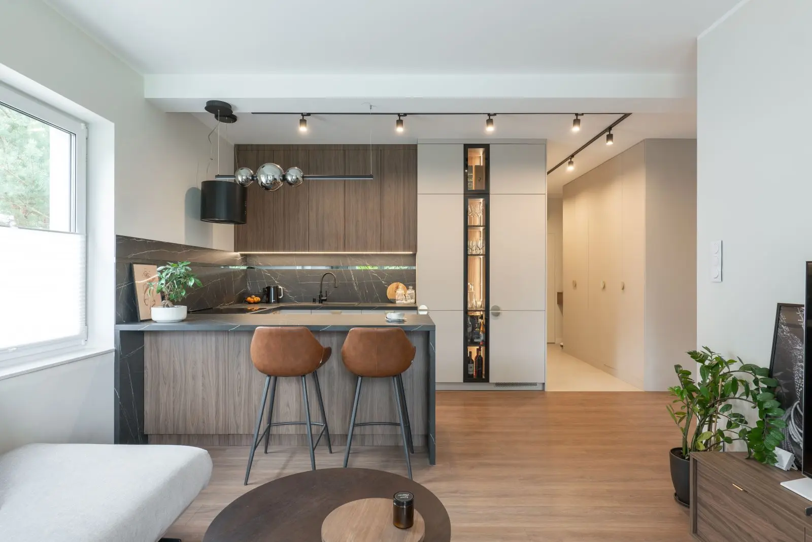 W dzisiejszych aranżacjach wnętrz coraz częściej spotykamy się z koncepcją otwartej kuchni, która płynnie łączy się z przestrzenią salonu. Takie rozwiązanie sprzyja integracji domowników, tworząc jednocześnie funkcjonalne i stylowe wnętrze. W jednym z naszych ostatnich projektów postanowiliśmy zrealizować właśnie taką koncepcję, łącząc elementy drewna, szarości oraz kamienia z delikatnym białym żyłkowaniem.