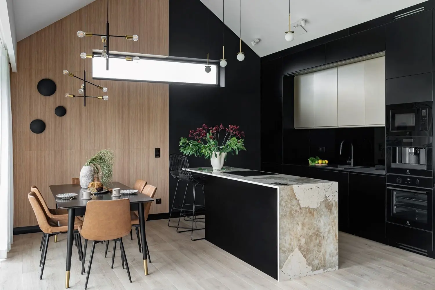 Interesujący jest także widoczny podział materiałów na ścianie szczytowej, który celowo nie został umieszczony w osi ścian. To zabieg wynikający z układu funkcjonalnego, gdzie priorytetem było umiejscowienie dużej wyspy kuchennej – serca domu. Odważne połączenie wyrazistej czarnej kuchni z delikatnym akcentem w perłowej odsłonie, stanowiącej tło dla wyspy kuchennej obłożonej nietuzinkowym spiekiem kwarcowym w odważnym wzorze, podkreśla nie tylko charakter mieszkania, ale także odzwierciedla indywidualność inwestorów.