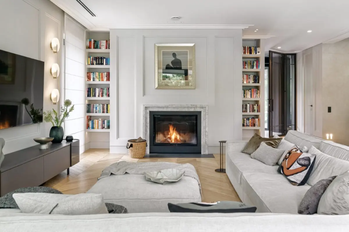 Tuż obok kuchni znajduje się salon. Na straży jego indywidualnej tożsamości stoją odpowiednio ustawione sofy zaprojektowane i wyprodukowane przez firmę KK Selection. Choć strefa wypoczynkowa jest „wciągnięta” w dużą otwartą przestrzeń, odpowiednia aranżacja sprawia, że panuje tu przytulna i kameralna atmosfera. Do dyspozycji domowników są książki wkomponowane w aranżację ściany. Zatapiając się w wygodnej sofie, w ciszy trzaskającego drewna w kominku, można w pełni oddać się lekturze.