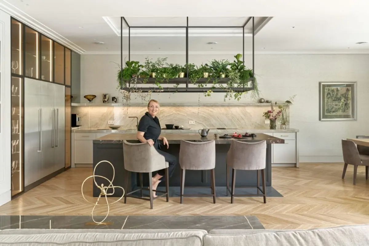 Aranżację dopełnia sztuka, jak obraz ,,Pływaczka” Jerzego Nowosielskiego wyeksponowany nad kominkiem oraz designerskie dodatki: patery, wazony, rzeźby oraz dekoracyjne meble i oświetlenie. Klasyczny sznyt dopełnia dębowy pakiet ułożony w jodełkę oraz sztukaterie.