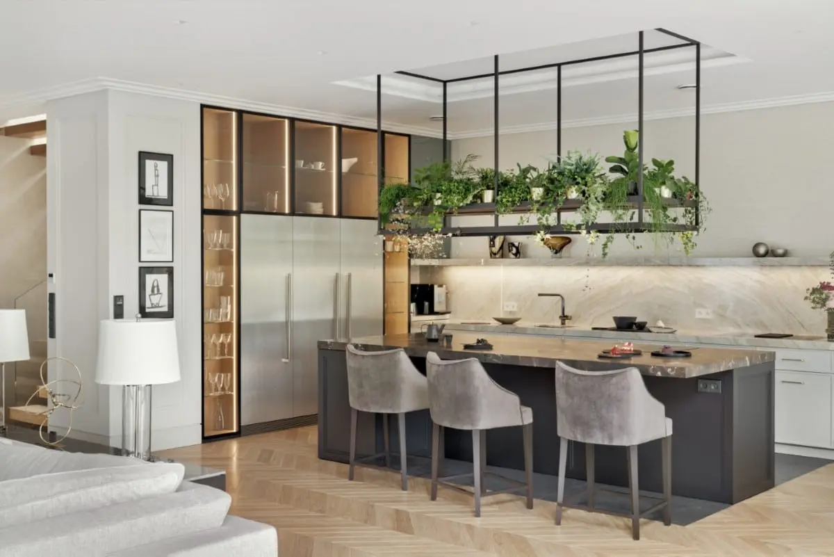 Monolityczną wyspę wykończoną kamieniem, wieńczy stalowy kwietnik. Ten koncept sprawił, że wnętrze przypomina barową przestrzeń.