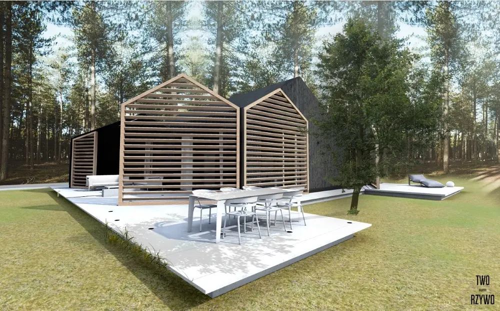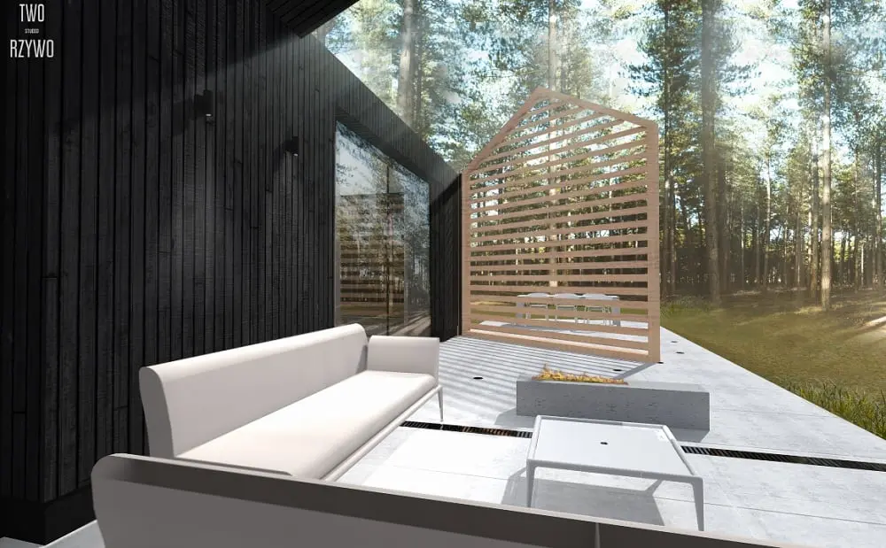 Tak jak frontowa elewacja odgradza dom od ulicy, tak tylna część domu i jedna z bocznych elewacji to obraz charakterów mieszkańców i ich podejścia do życia, funkcjonowania w przestrzeni jaką jest las. Wiedzą, że to on jest tutaj gospodarzem, że oni są tu tylko gośćmi. Dlatego duże tafle szkła pomagają mu wniknąć do wnętrza, zatopić dom w promieniach słonecznych i totalnie się w nim zadomowić.