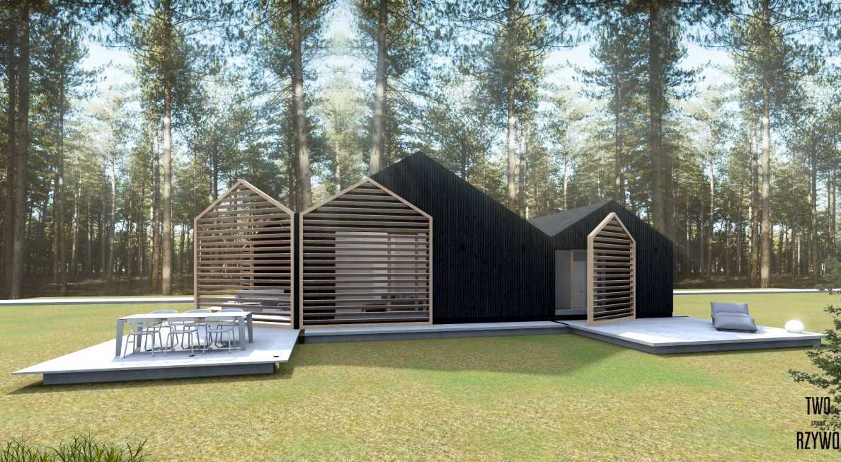Przestrzeni jest dużo- zarówno w środku jak i na zewnątrz. Dom otula taras, za sprawą którego możliwe jest obejście domu dookoła. Jest on też ekspozycją dla istniejących drzew oraz nowych nasadzeń. Dach skośny pod różnymi kątami nie zdradza nam czy skrywa część domu czy może kawałek tarasu. Nie da się zgłębić tej tajemnicy od frontu.