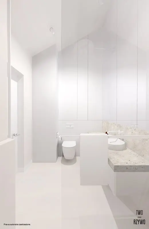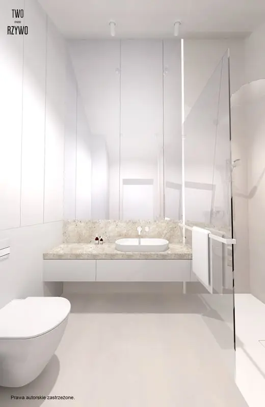 Minimalistyczna łazienka w bieli przełamana beżem.