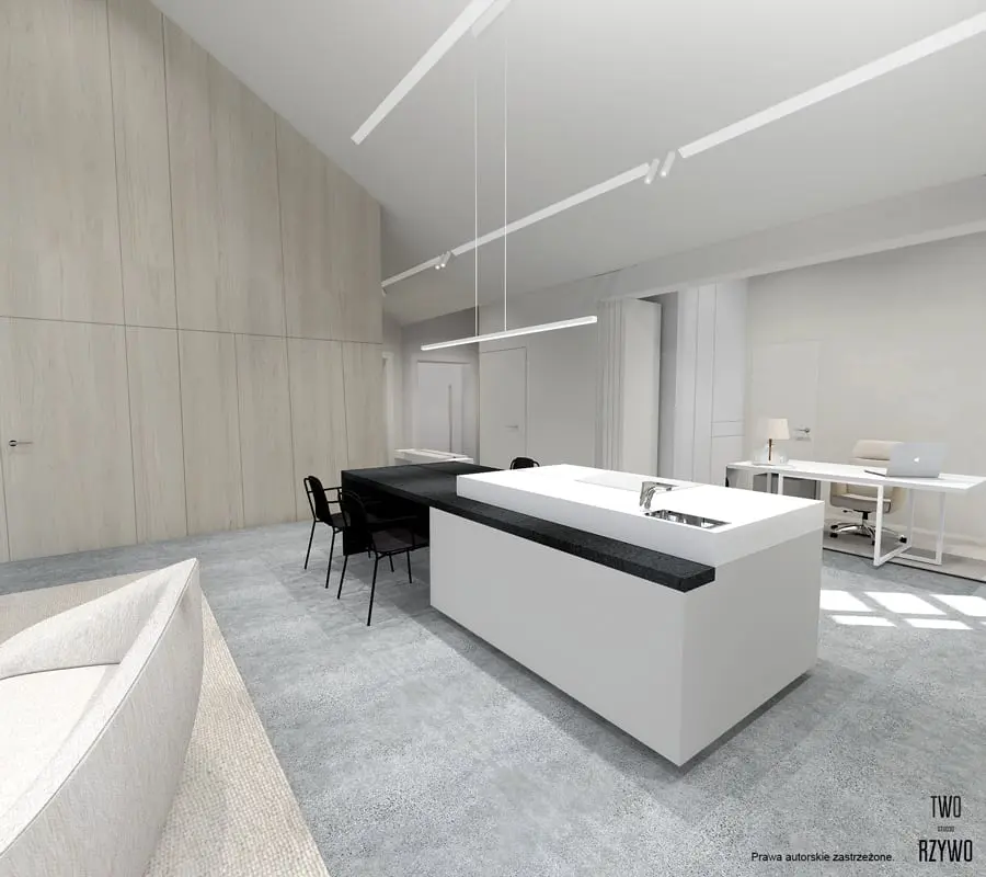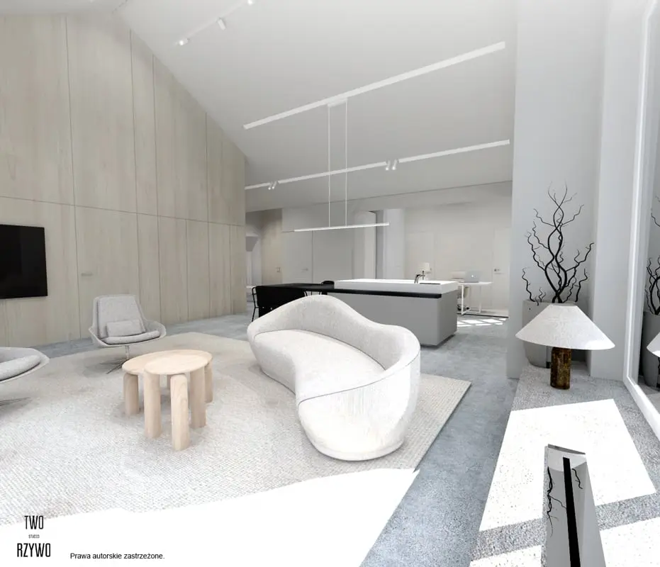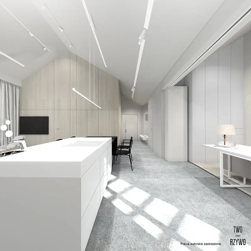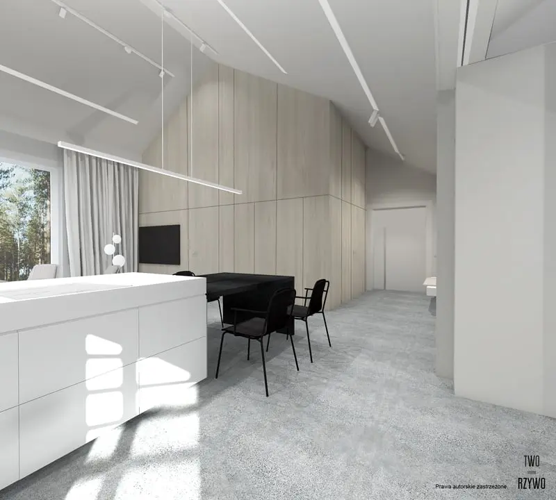 Oświetlenie szynowe techniczne znakomicie komponuje się z całą przestrzenią. Podkreśla wyjątkowy minimalistyczny wygląd wnętrza.