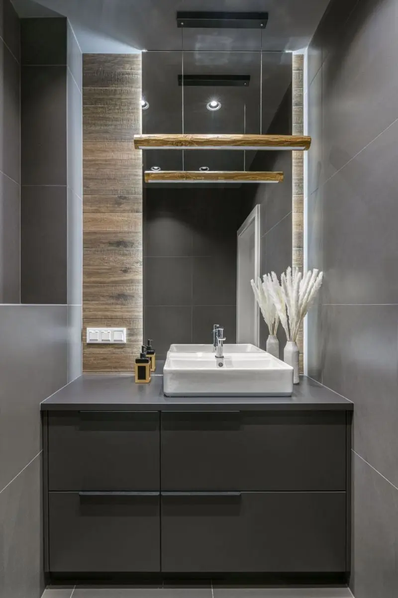 W podobnej konwencji utrzymane są także dwie łazienki w domu. Pierwsza z nich powiela schemat kolorystyczny znany z sypialni. Dominują tu ciemne kolory, które rozświetlają ciepłe, drewniane akcenty. W drugiej odnajdziemy nieco jaśniejszą kolorystykę w różnych tonacjach szarości. Wystrój ocieplają drewniane akcenty, jak chociażby wykonana na zamówienie szafka pod umywalkę.