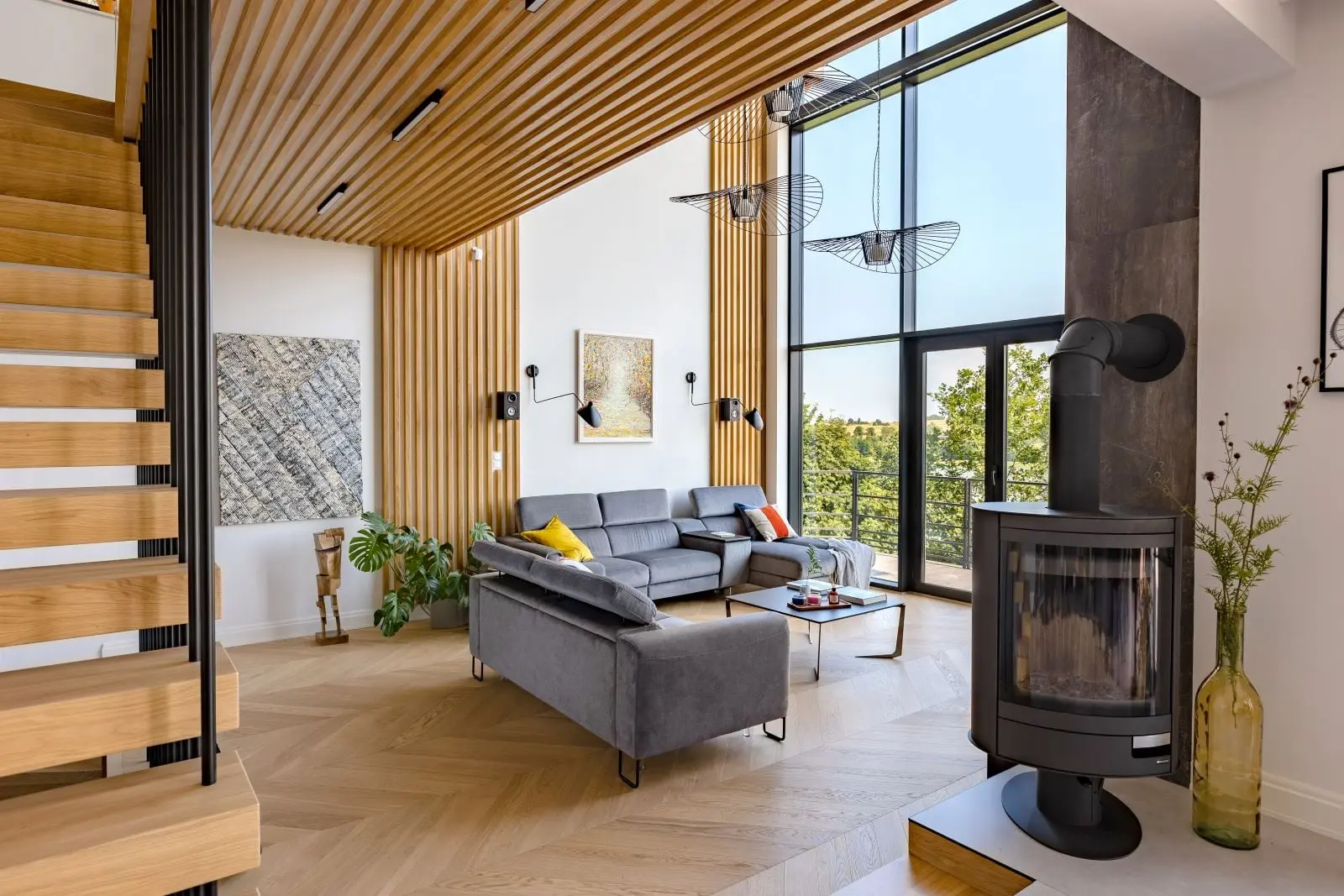Na pierwsze piętro prowadzą „lewitujące” stopnie, a do piwnicy zainstalowano klasyczne, solidne schody. Dzięki wykorzystaniu delikatnej, ażurowej balustrady z tralek, ciągnącej się od podłogi do sufitu, udało się zabezpieczyć obie sekcje schodów, łącząc funkcję z estetyką. Na antresolę prowadzi natomiast balustrada ze szkła, która zachowuje pełną przejrzystość i pozwala cieszyć się widokiem na malowniczy krajobraz otaczający budynek.