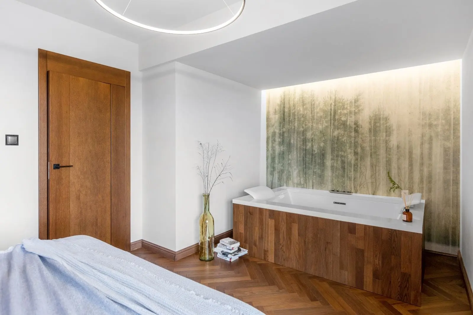Główną inspiracją stała się tu otaczająca przyrodą – jej kolory i faktury. Wnętrza tego domu emanują harmonią dzięki wykorzystaniu naturalnych fornirów, granitu, wysokiej jakości gresów oraz starannie wyselekcjonowanego drewna. Aby wprowadzić intrygujący kontrast, zastosowano również stal – tworzywo stworzone przez ręce człowieka.