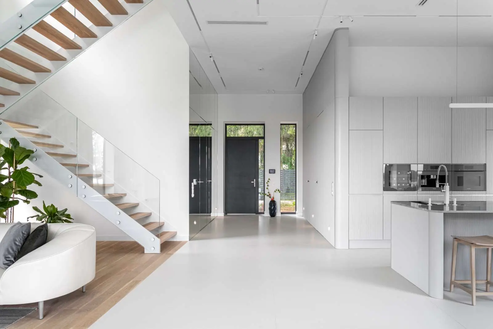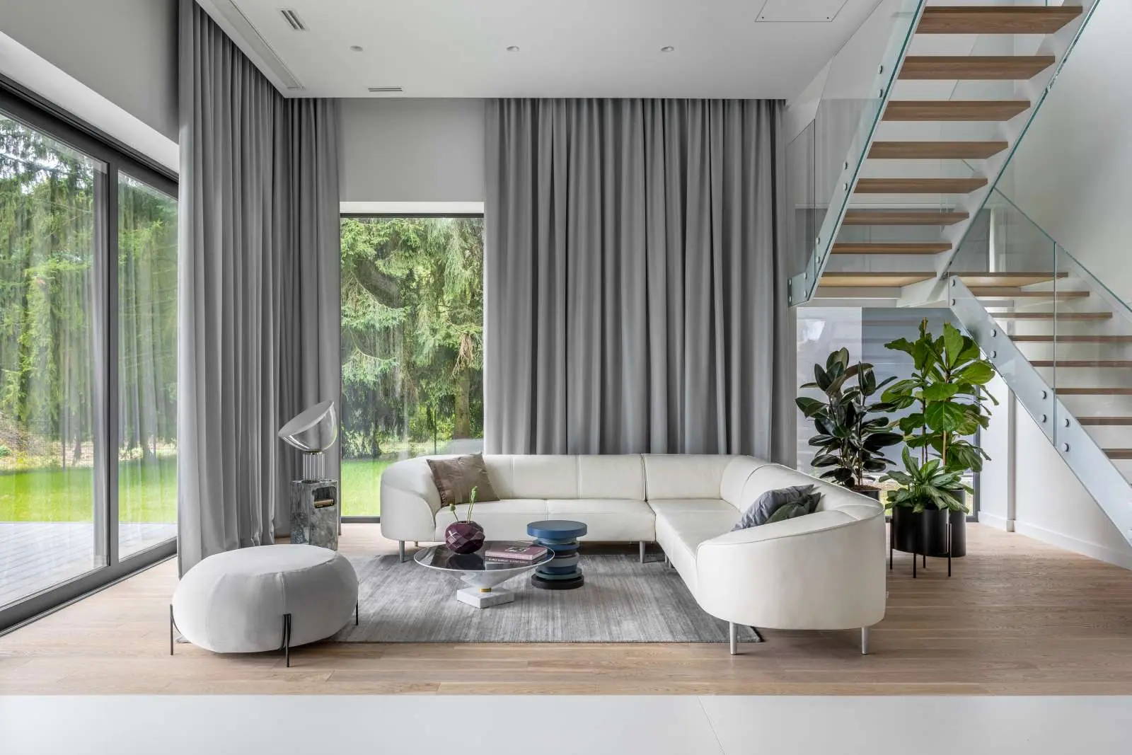 Od holu, jadalni i kuchni salon oddzieliła tylko granica dwóch rodzajów posadzki. Tam – wielkoformatowe (320×160 cm) białe spieki, tu – cieplejszy w odbiorze bielony dąb. Obie przestrzenie ściśle łączą się jednak za sprawą palety barw. W całość spina je także sufit podwieszany z delikatną siatką szyn systemu oświetleniowego, która tworzy geometryczne podziały. Ponad białą płaszczyzną sufitu znalazła się też centralna klimatyzacja, przy tak dużych oknach konieczna.