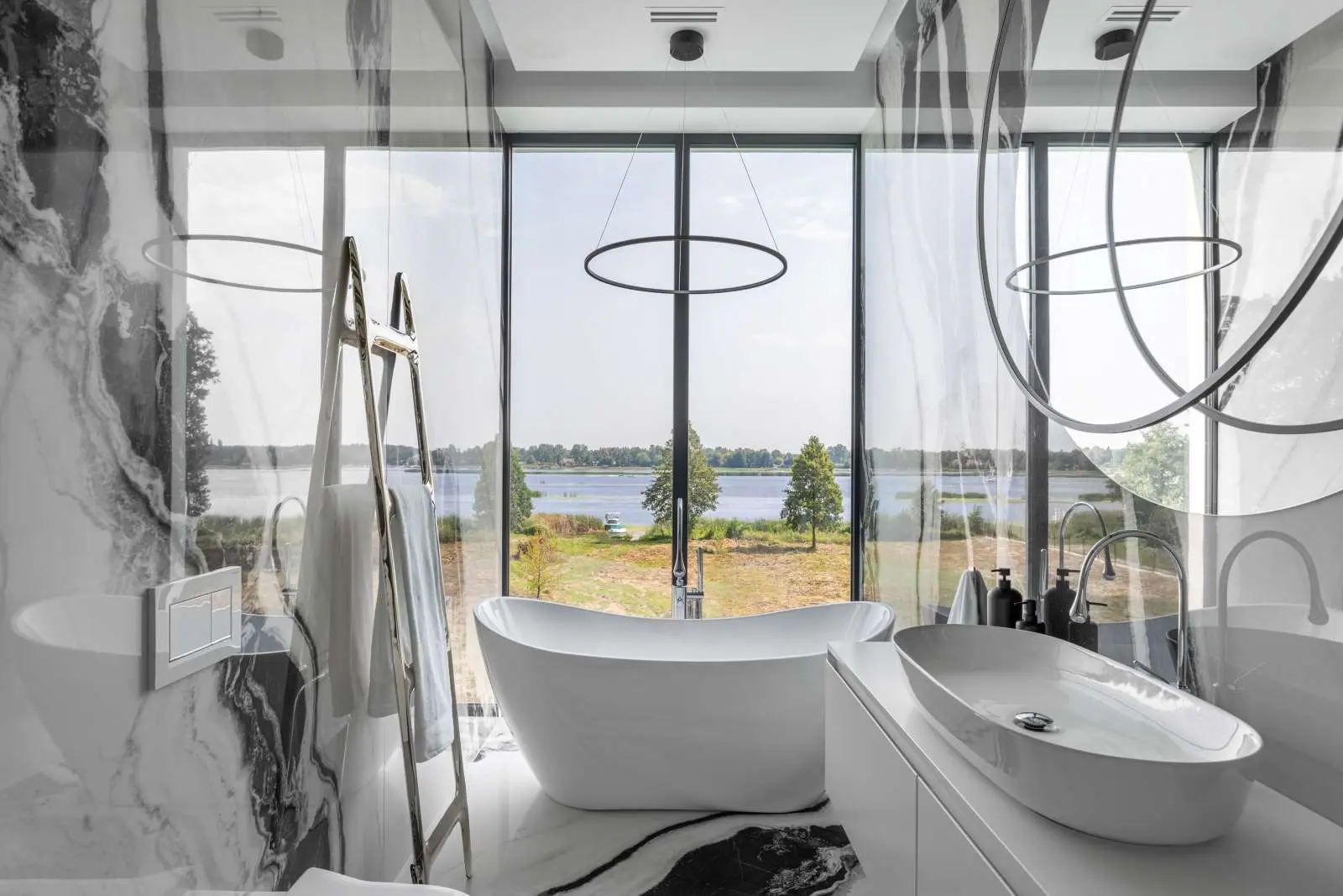 Na tle wspaniałego czarno-białego wzoru pojawiły się minimalistyczne białe sprzęty. Intryguje tu detal, taki jak baterie w formie kropel (Gessi), drabinka z dmuchanej stali (Zieta Prozessdesign) czy lampy Ramko w kształcie okręgów. Jedna z nich zawisła pod sufitem – w poziomie, inna nad umywalką – w pionie. Za sprawą zwielokrotnionych odbić w lustrze i w polerowanych taflach spieków, po zapaleniu dają niezwykły efekt wizualny. Niemniej – największe wrażenie robi tu oczywiście wanna, która oferuje możliwość kąpieli z rzeką w perspektywie.