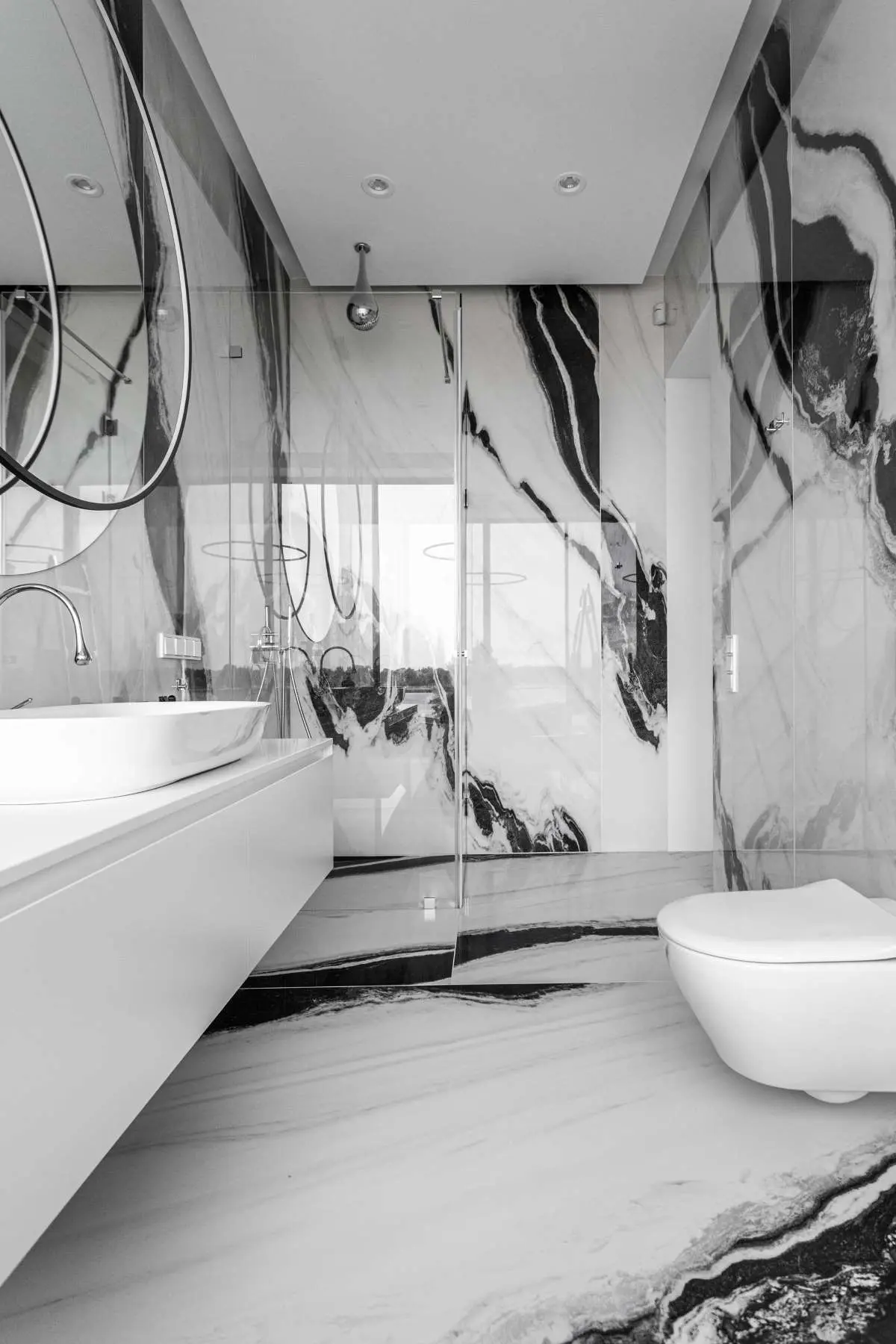 Osobista łazienka pana domu zwraca uwagę szalenie efektownym wzorem spieków kwarcowych zainspirowanych czarno-białym marmurem Panda.