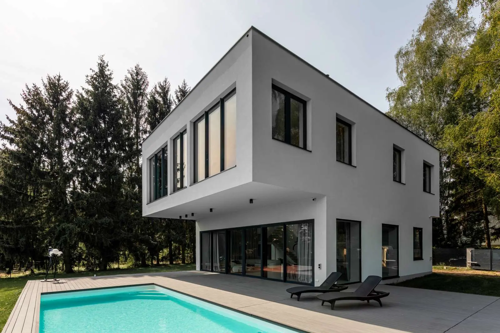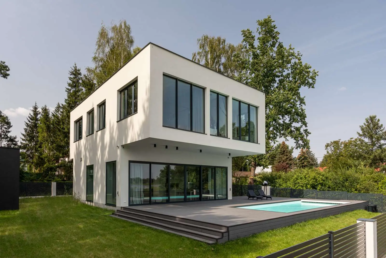 Za przeszklonymi ścianami przestrzeni dziennej na parterze oraz aż pięciu sypialni na piętrze roztacza się hipnotyzujący widok na Narew. Połyskujące w słońcu fale można też oglądać z wanny, jednak dopóki dopisuje pogoda, jeszcze przyjemniej pluskać się w ogrodowym basenie.