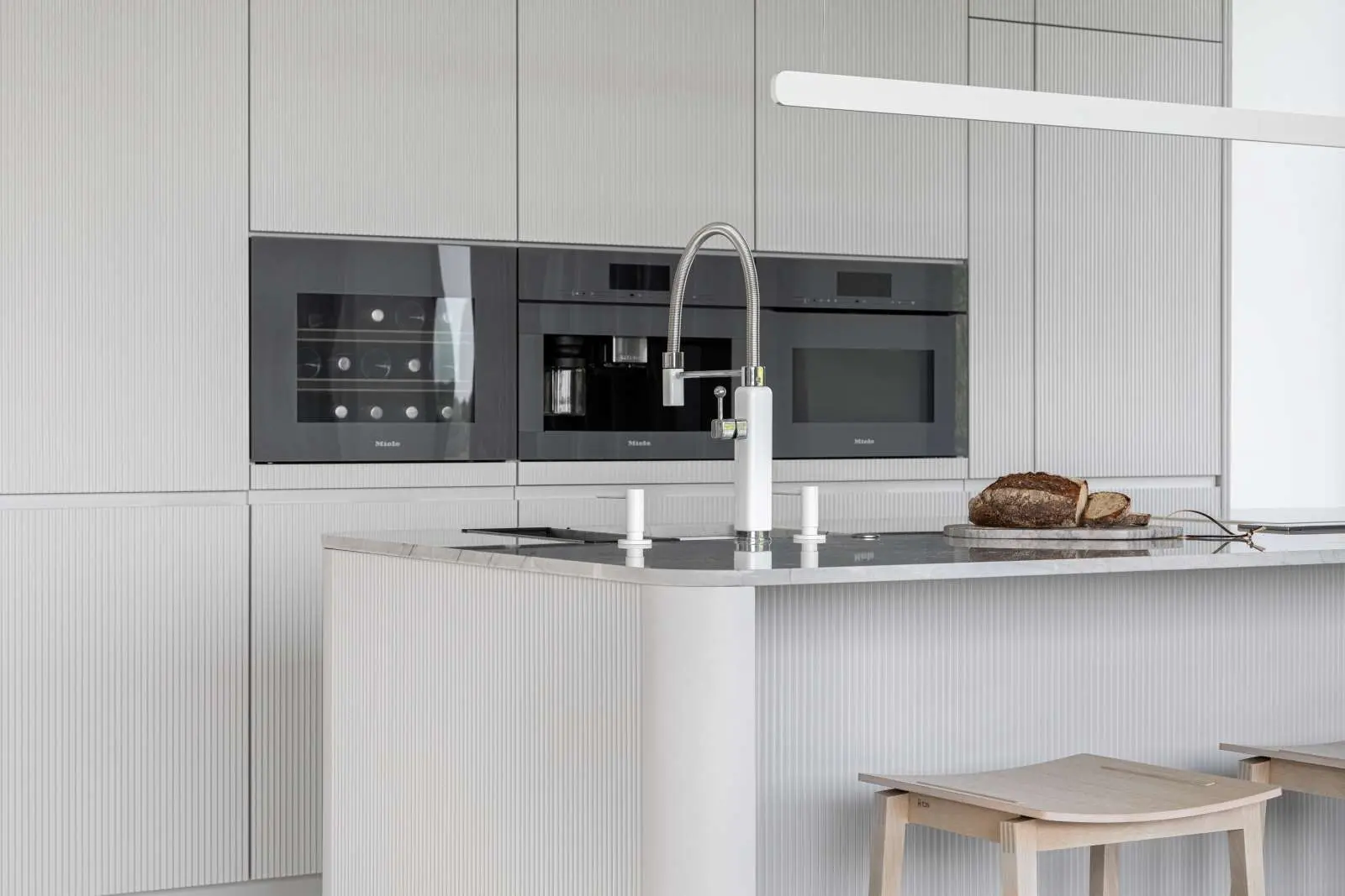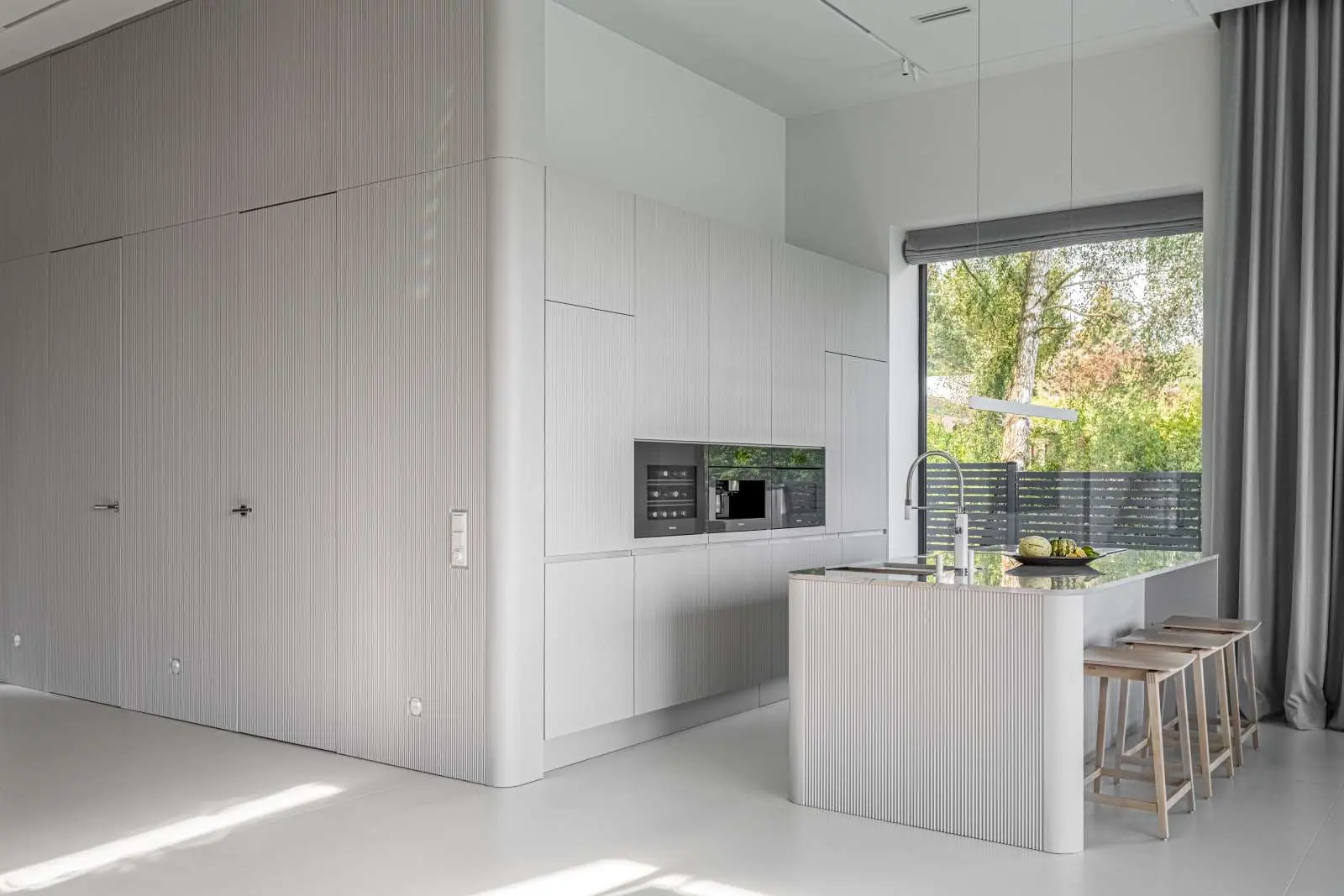Nie byłoby jadalni, gdyby nie kuchnia. W pierwszej chwili jej zabudowa zwraca uwagę dialogiem szarego kamiennego blatu i ryflowanych frontów (podobnie jak wiele innych elementów w domu, meble kuchenne z najwyższą starannością wykonało Studio Prostych Form). Dopiero bliższa interakcja z tą strefą przestrzeni dziennej pozwala się przekonać, że pośród najwyższej klasy sprzętów (Miele, Smeg) znalazły się aż trzy chłodziarki, a konkretnie elegancka winiarka oraz dwie duże lodówki w zabudowie. – Gdy towarzystwo zjedzie się tu na grilla, obie pękają w szwach. Przydałaby się kolejna – śmieje się Piotr Łucyan.