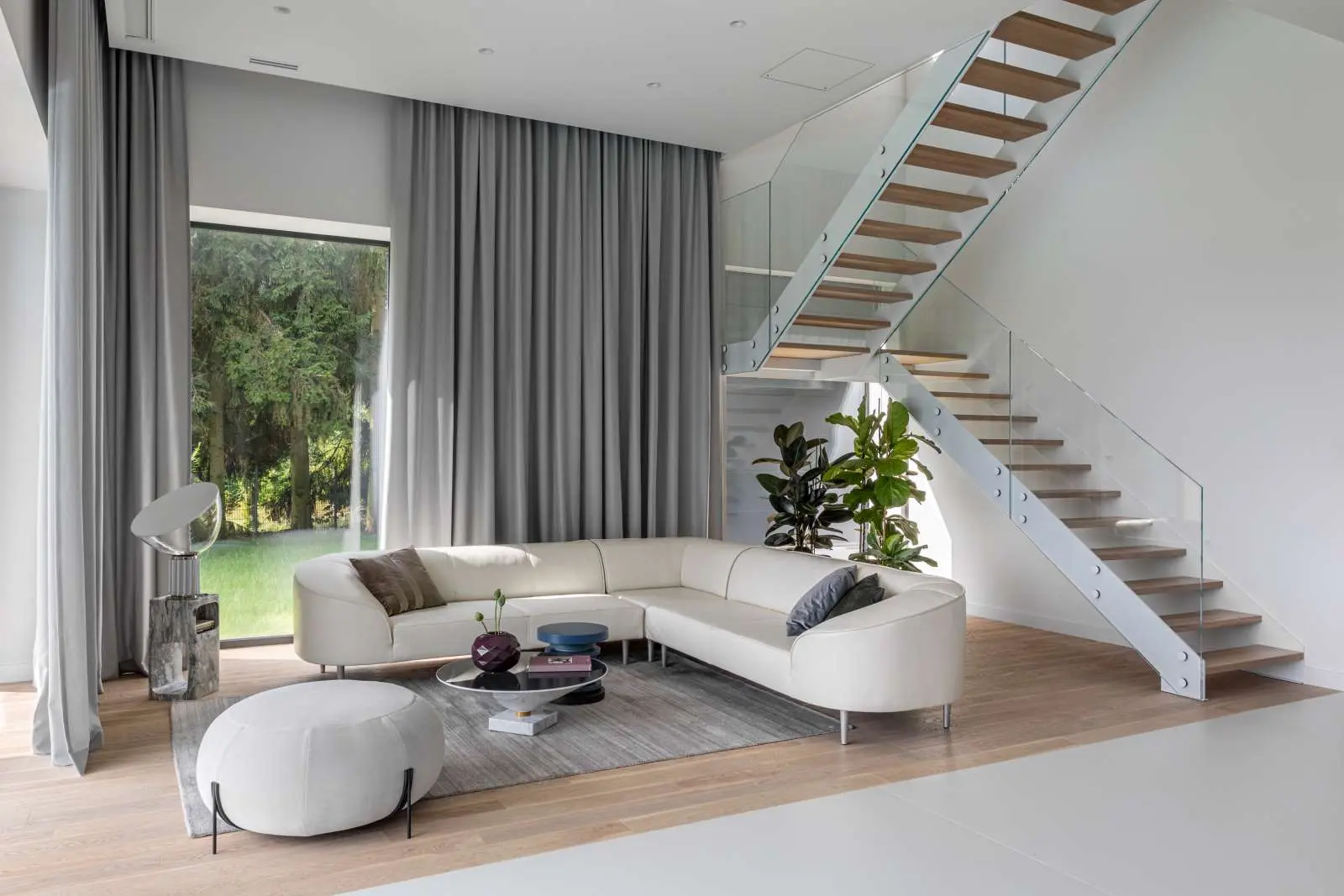 Sofa stanęła na tle schodów. Stopni jest tu niemało, gdyż parter ma aż 420 cm wysokości – dzięki czemu całość daje wspaniałe odczucie przestrzeni (podobnie jest na górze, która liczy 360 cm wysokości – tyle, ile tylko dozwalał miejscowy plan zagospodarowania przestrzennego). Jednak przy nietypowych parametrach zaczęły się… schody. – Pierwotnie miała się tu znaleźć konstrukcja szklana, ale odpowiednią do tego domu taflę trzeba by sprowadzać z zagranicy. Stanęło więc na stali, jednak i ona w ostatnim czasie była trudno dostępna. Właśnie schody w największym stopniu wydłużyły czas realizacji – mówi Piotr Łucyan. Na szczęście już są, świetnie służą i doskonale wyglądają. W przyszłości w holu u ich szczytu pojawi się galeria obrazów (stąd m.in. decyzja o zastosowaniu bardzo dyskretnych drzwi typu secret).