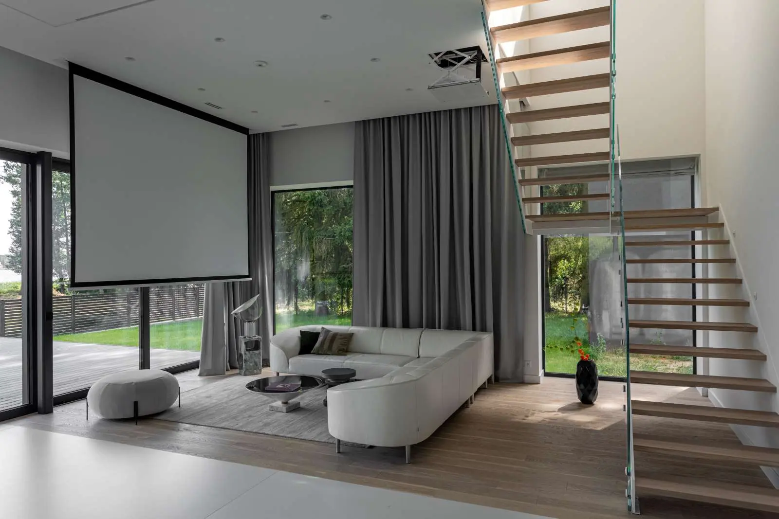Ale w strefie wypoczynkowej sufit kryje jeszcze coś – projektor oraz zwijany ekran. – Latem nie są wykorzystywane, gdyż za wszelkie projekcje służy widok. Czekają jednak na dni niepogody, aby gospodarzowi i jego gościom zapewnić rozrywkę, gdyby urok krajobrazu nie był aż tak magnetyczny – wyjaśnia Piotr Łucyan. Z myślą o seansach filmowych wielkoformatowe okna zostały zaopatrzone w zasłony typu blackout. Co ciekawe, taka sama zasłona na co dzień usuwa z oczu ekran telewizora. Gdzie go w razie potrzeby szukać? Na bocznej ścianie w sąsiedztwie jadalni i kuchni. A jeśli pozostaje niewidoczny, to po to, by nie zakłócał przestrzeni i nie odciągał spojrzeń od krajobrazu.