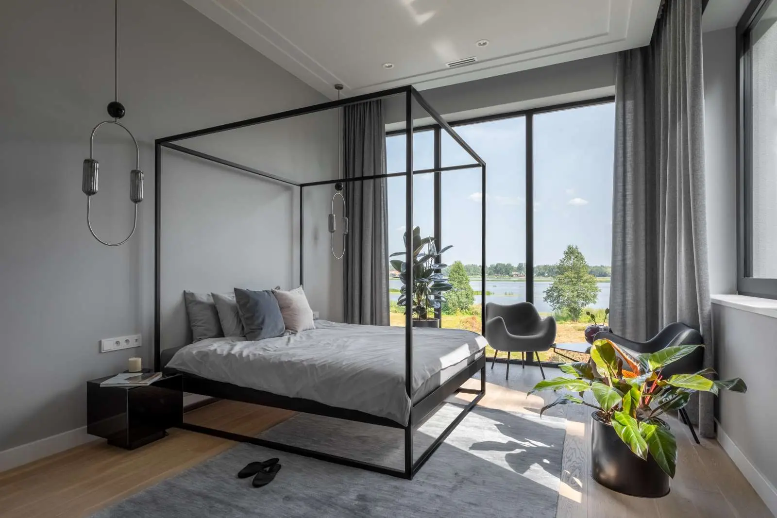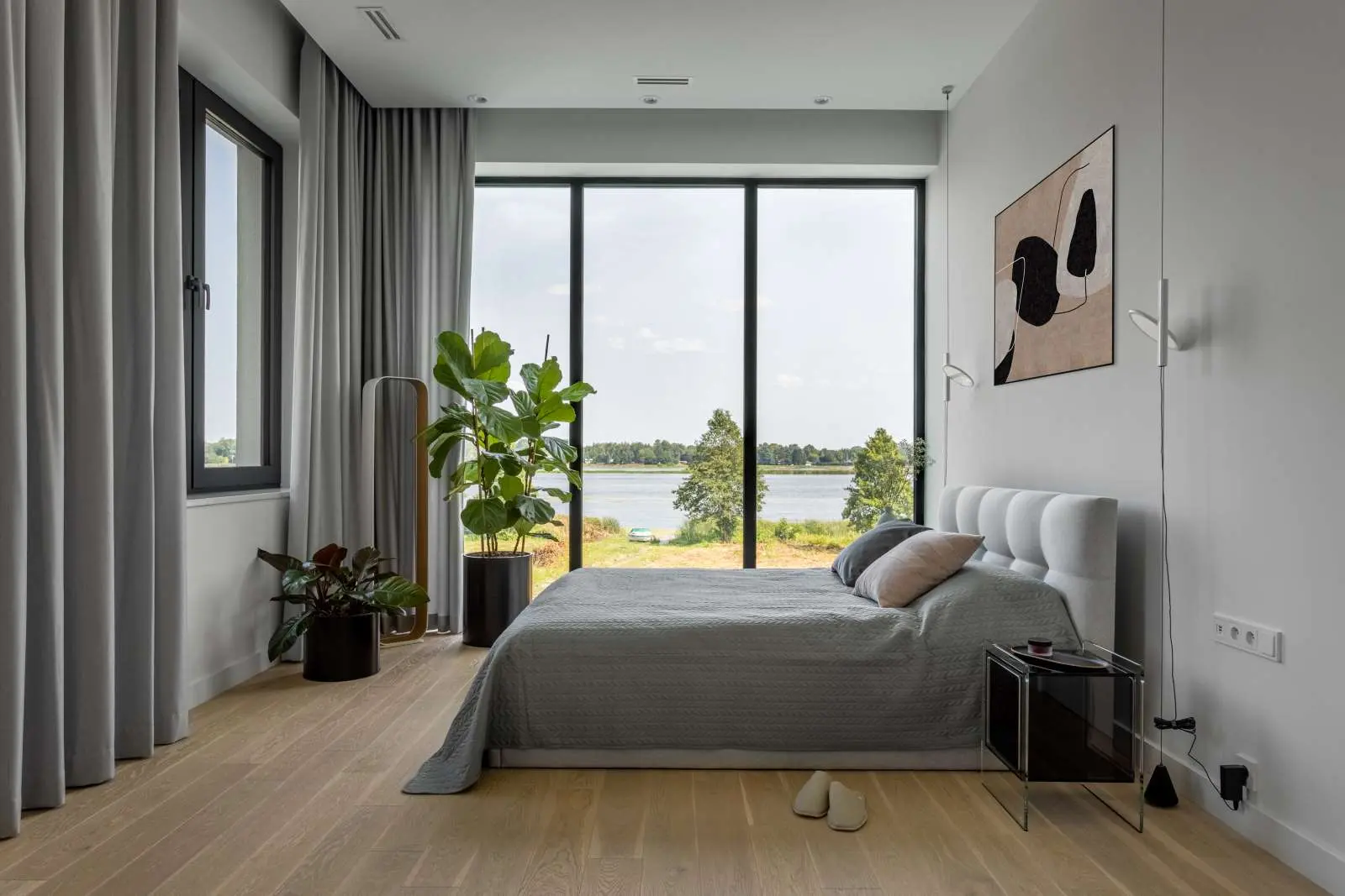 Prywatną część willi tworzy sypialnia właściciela z osobistą łazienką oraz garderobą. Kluczowym tu meblem jest oczywiście rozłożyste łóżko. Najważniejszym składnikiem aranżacji jest jednak bez wątpienia widok na Narew, jaki roztacza się nie tylko za oknem na wprost łóżka, ale przede wszystkim za przeszkloną ścianą boczną.
