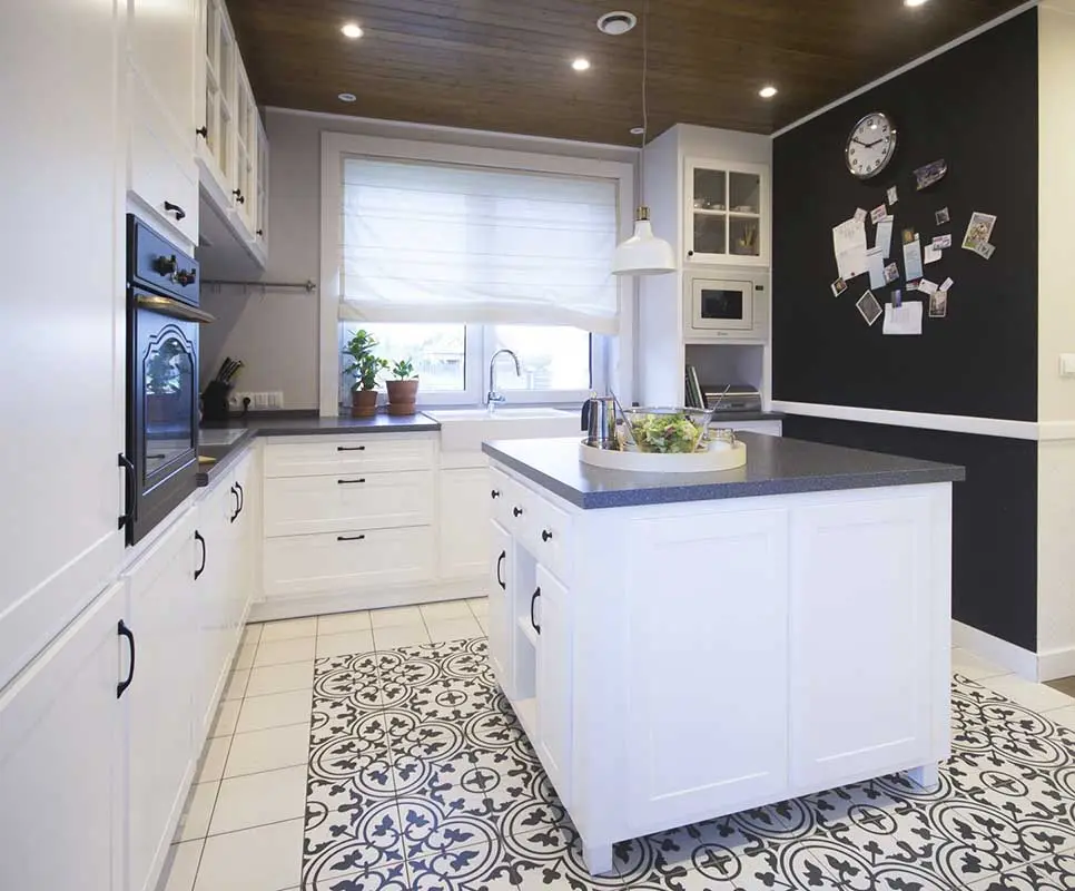 Posadzka to kolejny ważny element tego wnętrza. Graficzne kwiatowe wzory płytek podkreślają lokalizację wyspy, a płytki gładkie „rysują” trasy komunikacji. Piękny zlew ceramiczny jest kropką nad „i”, a doskonale dobrane do wnętrza lampy uzupełniają całość.